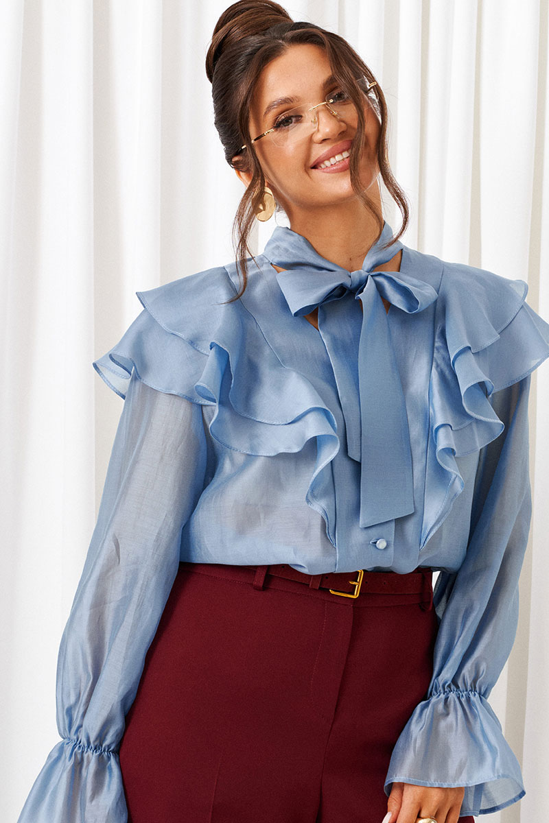 Комплект женский 2-ух предметный: блузка в романтическом стиле и классические брюки. Выполнен в комбинации изысканных костюмного и вуального полотен актуальных контрастных оттенков.