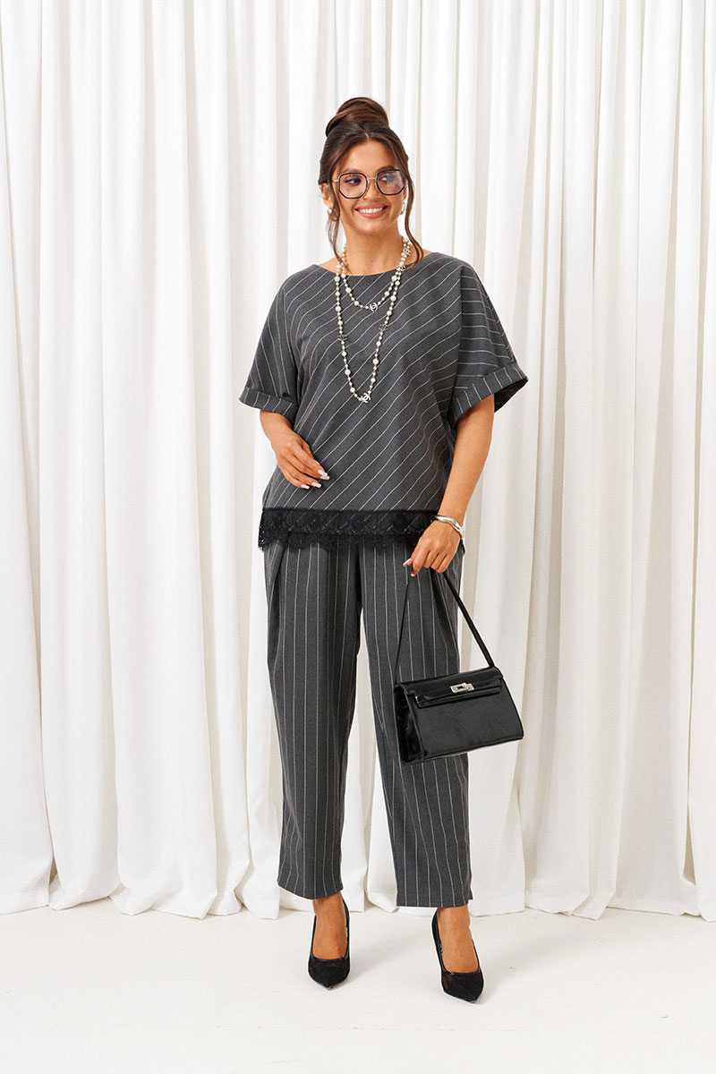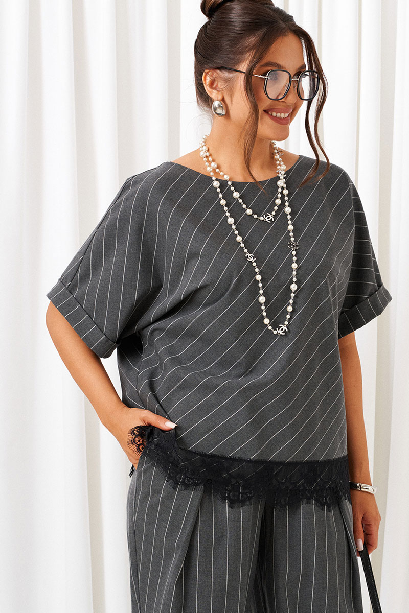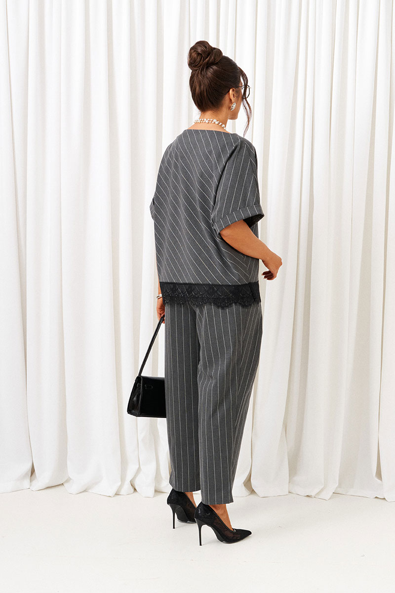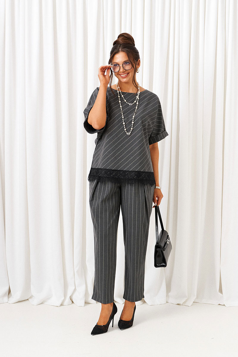 Костюм состоит из 2 предметов одежды: блузона и брюк. Выполнен из костюмной ткани стильного дизайна в полоску.
