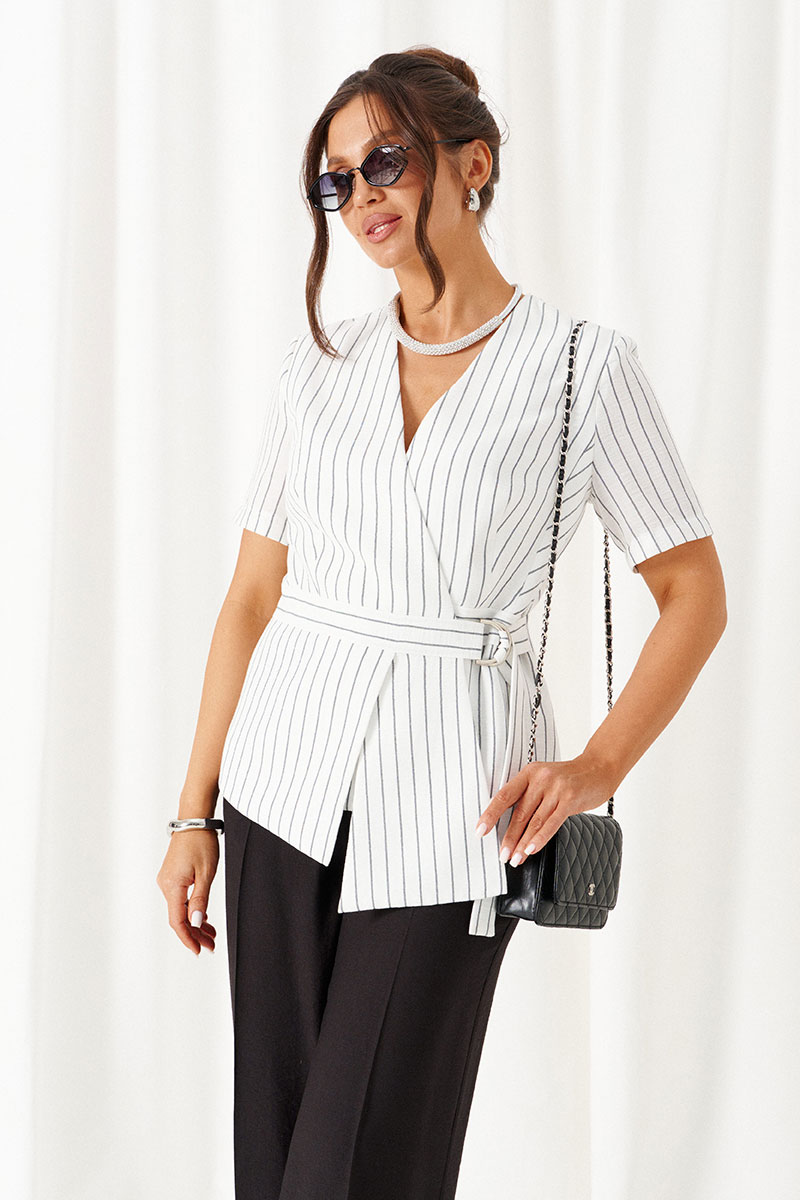 Жакет прилегающего силуэта на подкладке. Передняя часть с горизонтальным подрезом в виде декоративного пояса.