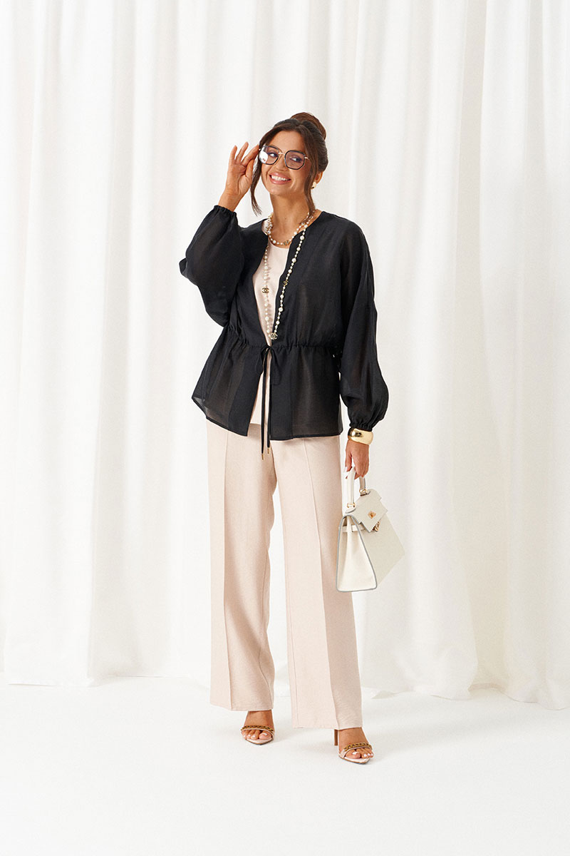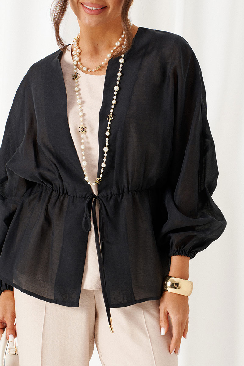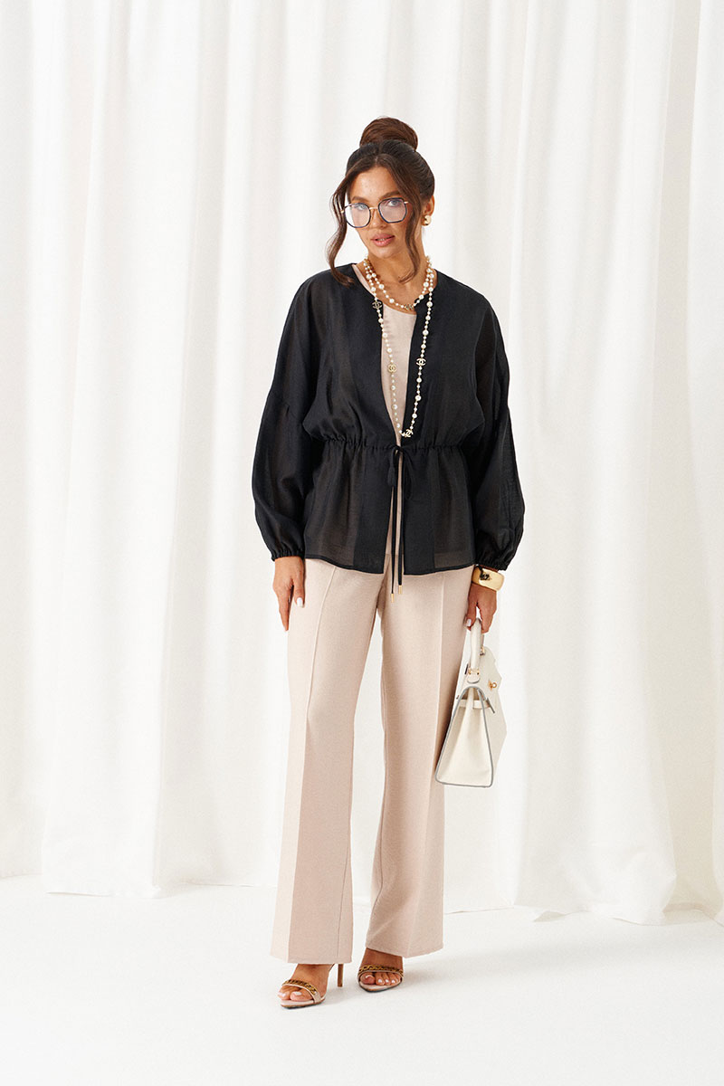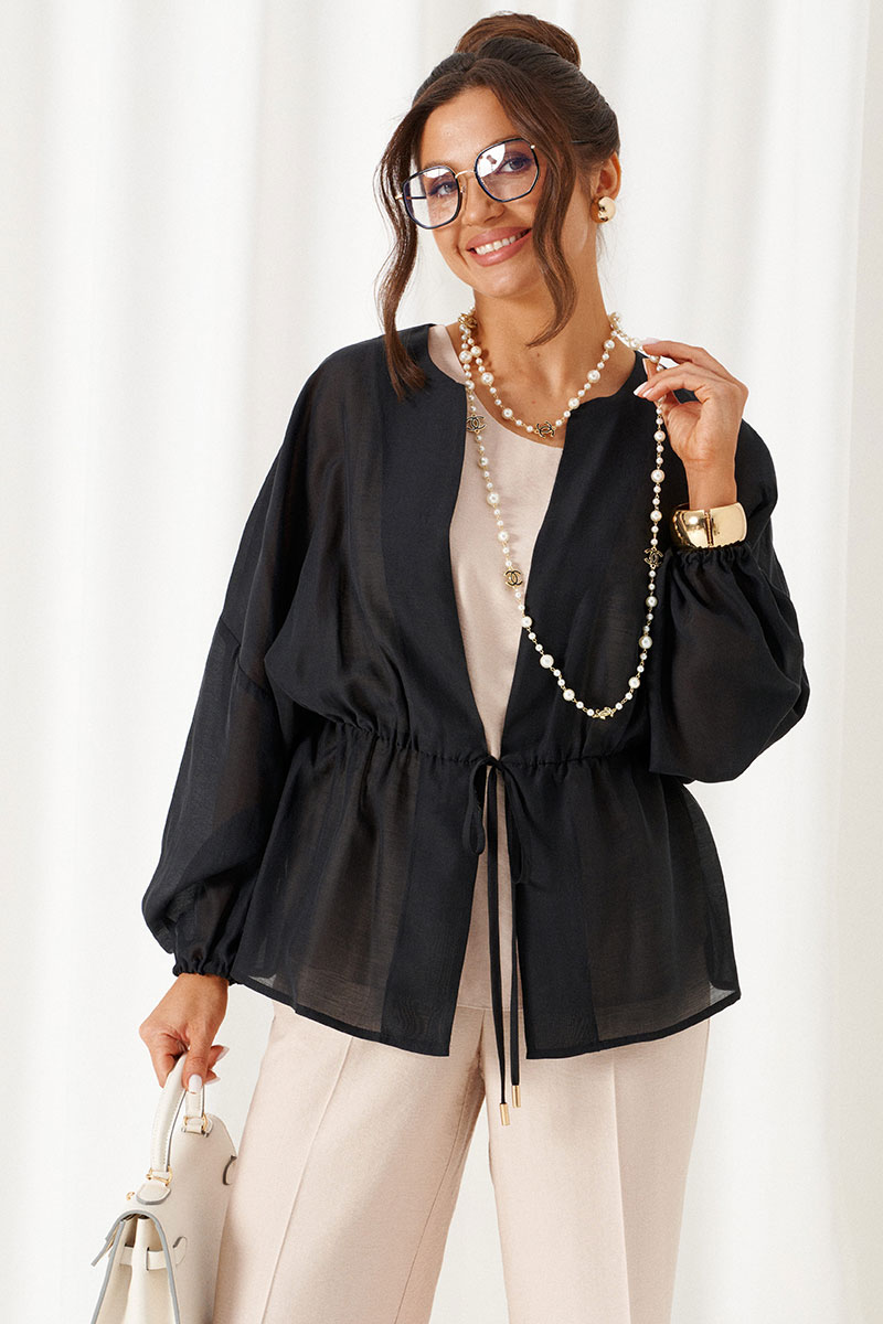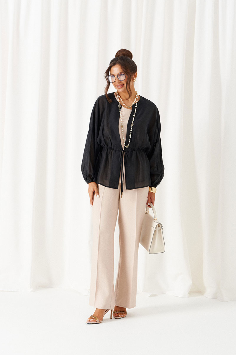 Блузка свободного силуэта с фиксацией по талии на завязки с декоративными наконечниками.