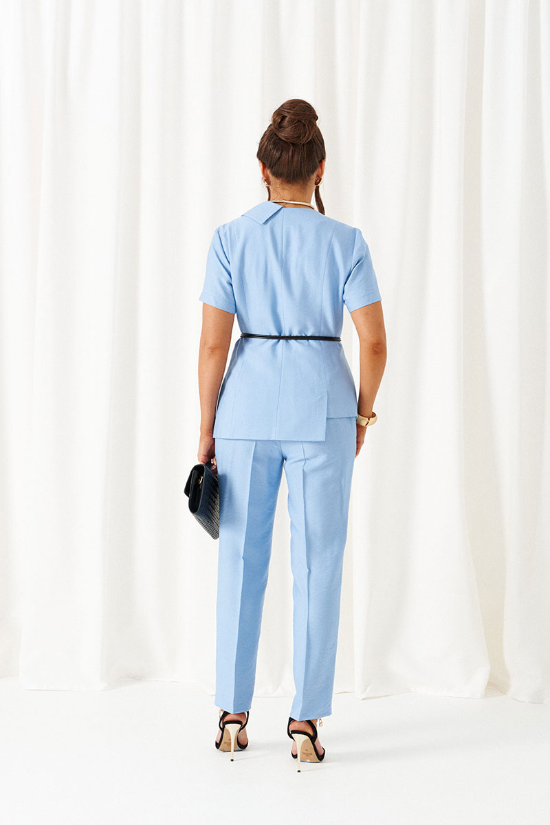 Выразительный костюм состоит из жакета и брюк, выполнен из мягкой смесовой ткани с натуральными волокнами льна и вискозы, практичен в носке.