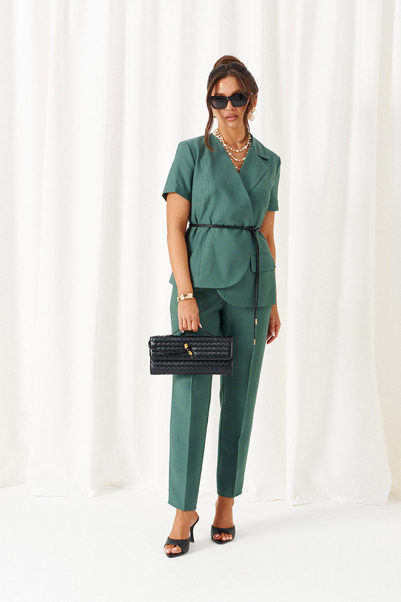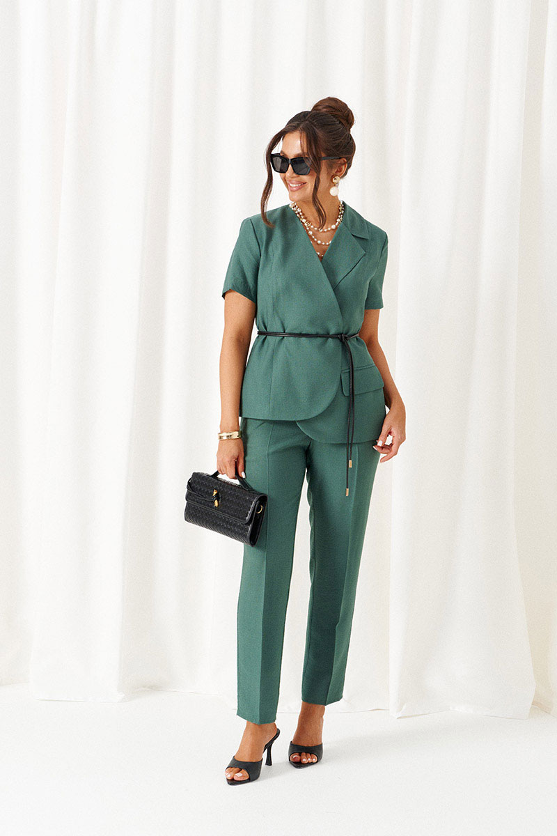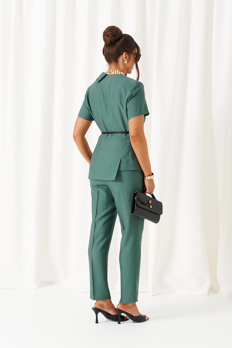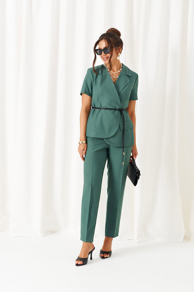 Выразительный костюм состоит из жакета и брюк, выполнен из мягкой смесовой ткани с натуральными волокнами льна и вискозы, практичен в носке.