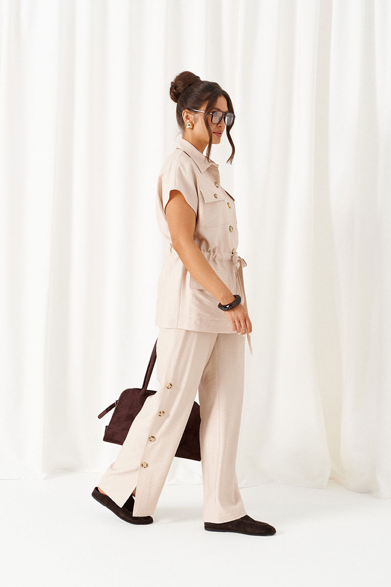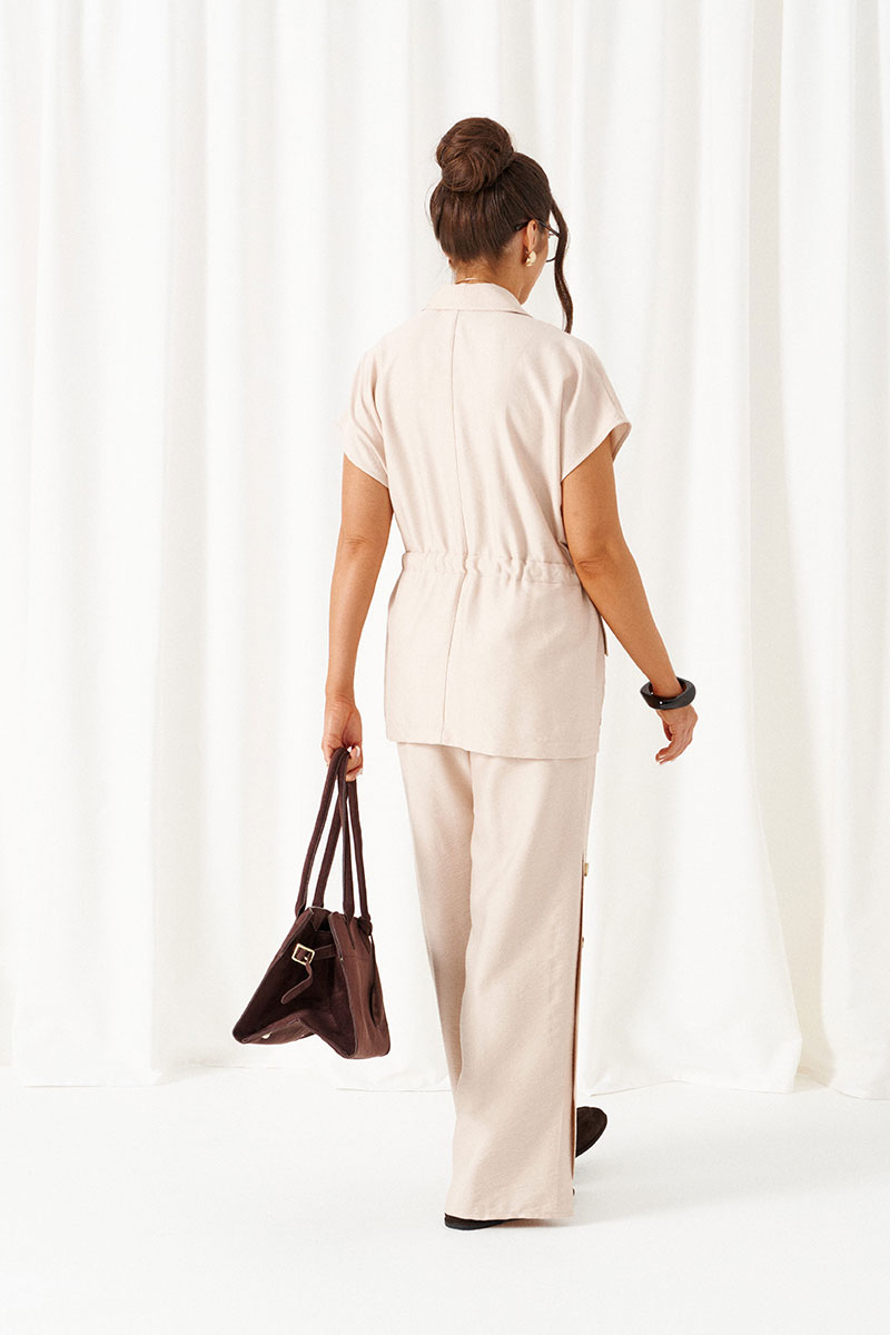 Стильный костюм состоит из жакета-рубашки и брюк, выполнен из мягкой ткани с волокнами льна и вискозы, практичен в носке.