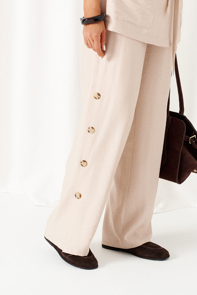 В боковом шве на одной брючине ниже уровня колена выполнена шлица с закреплением на декоративные пуговицы, вторая брючина классического кроя.