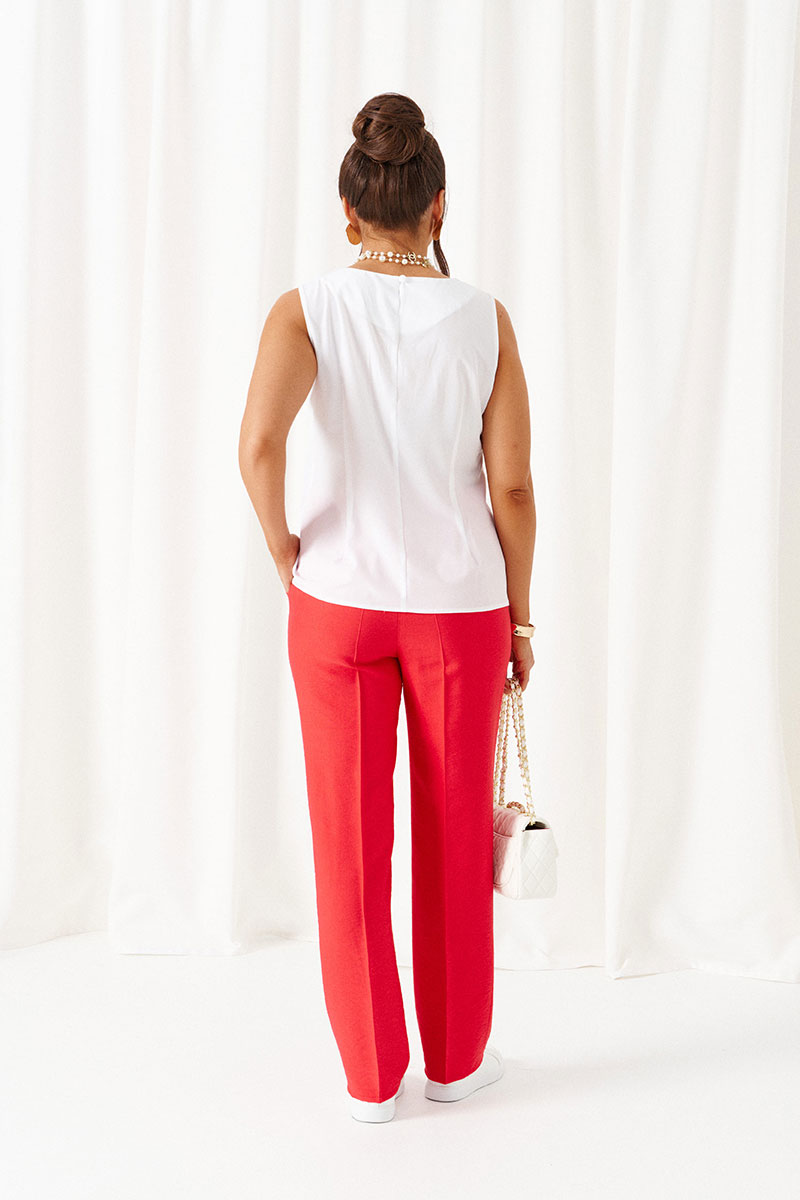 Универсальный комплект из блузки, брюк и топа – изделие вне времени и трендов, созданное в различных интерпретациях: от оверсайза до классики. Выполнен из смесового полотна с содержанием натуральных волокон – льна и вискозы, предназначен для повседневного и выходного использования. Найдет применение в жаркую и прохладную летнюю погоду.