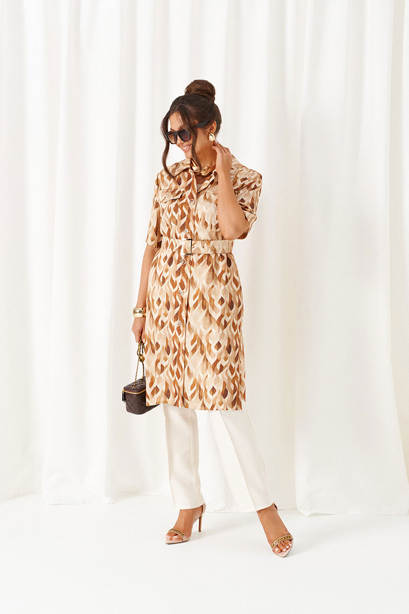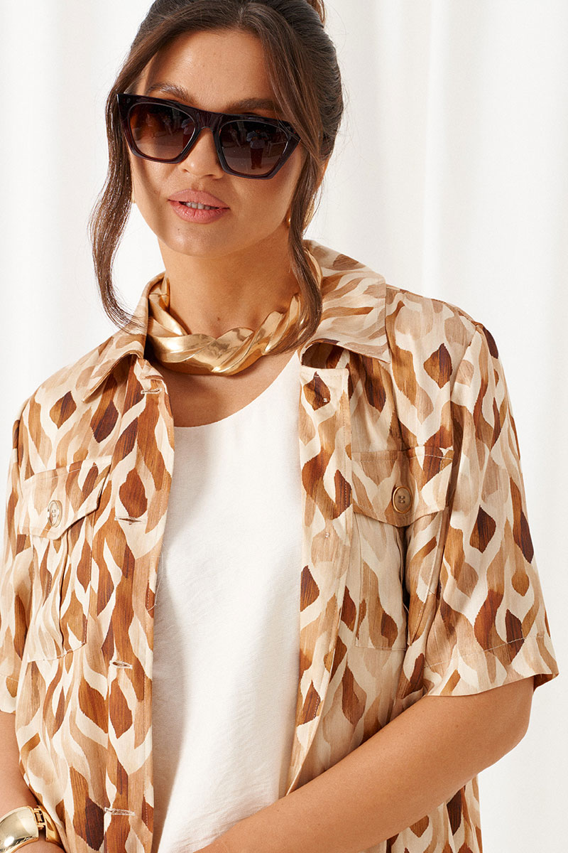 Передняя часть распашная с нагрудными вытачками от бокового шва. Вверху расположены функциональные накладные карманы с клапанами. Спинка с кокеткой в верхней части.
