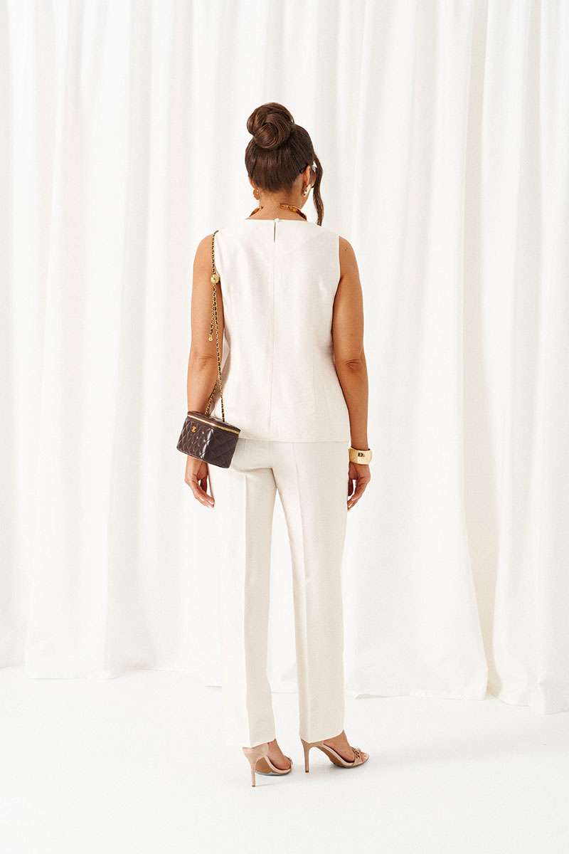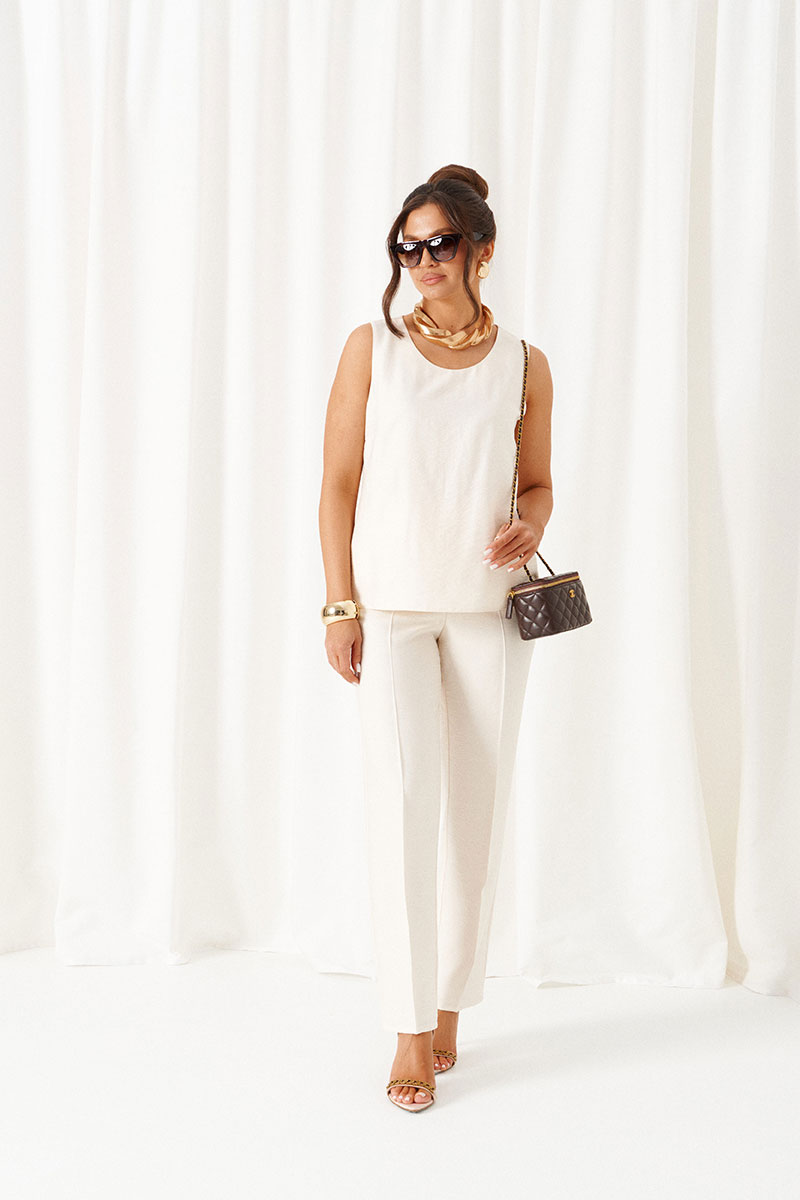 Универсальный комплект из блузки, брюк и топа – изделие вне времени и трендов, созданное в различных интерпретациях: от оверсайза до классики. Выполнен из смесового полотна с содержанием натуральных волокон – льна и вискозы, предназначен для повседневного и выходного использования. Найдет применение в жаркую и прохладную летнюю погоду.