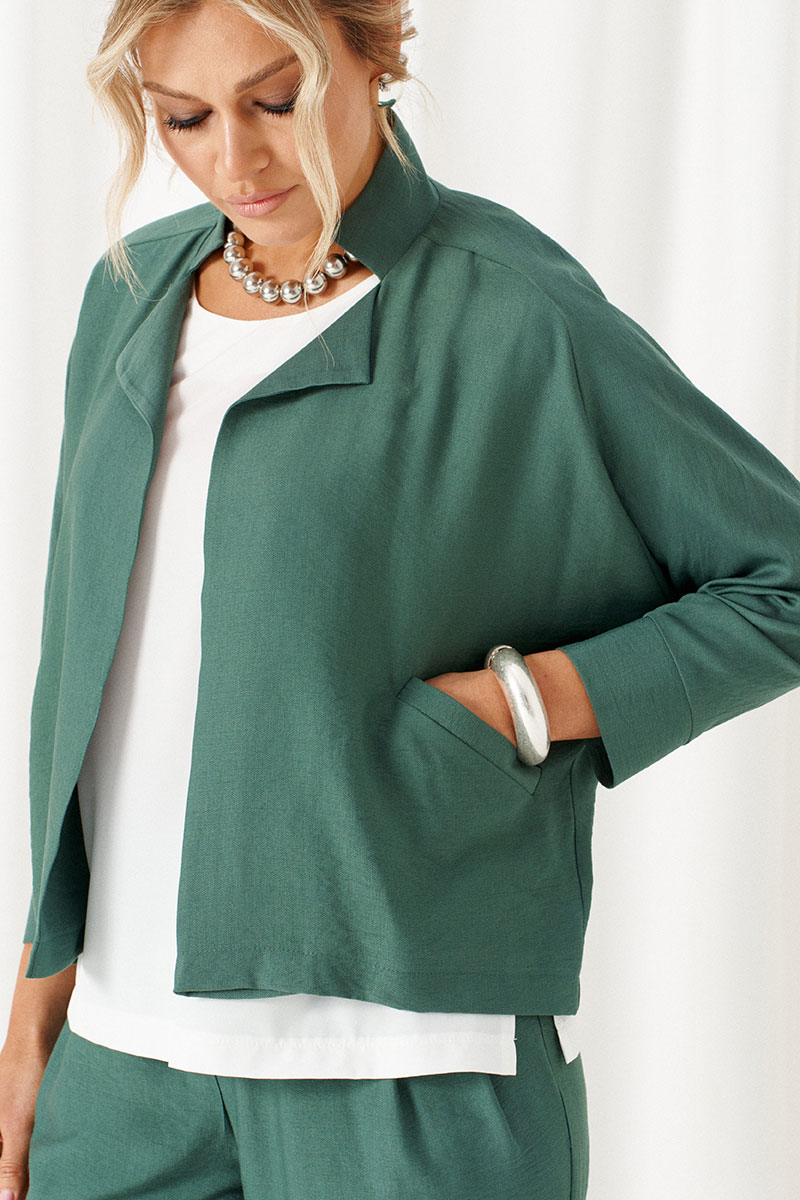 Жакет свободного силуэта выполнен из смесового полотна с содержанием натуральных волокон.