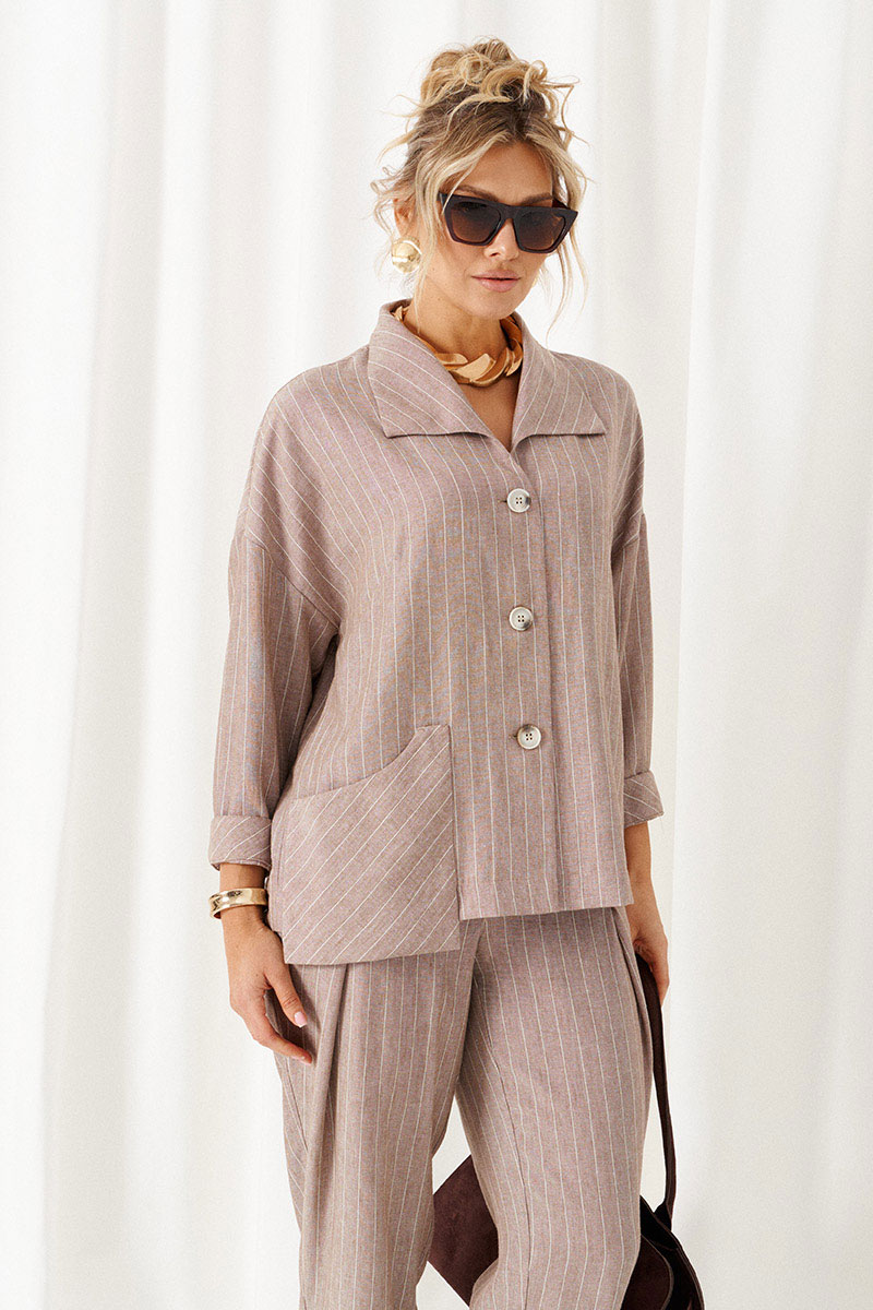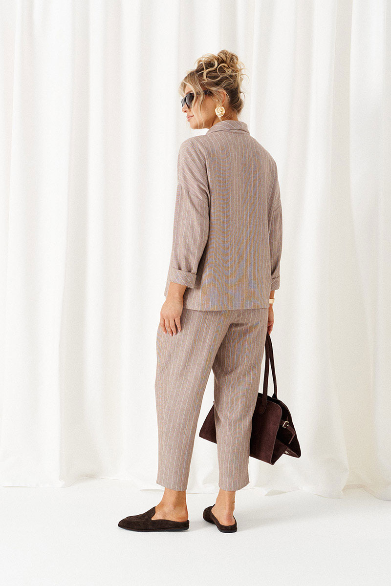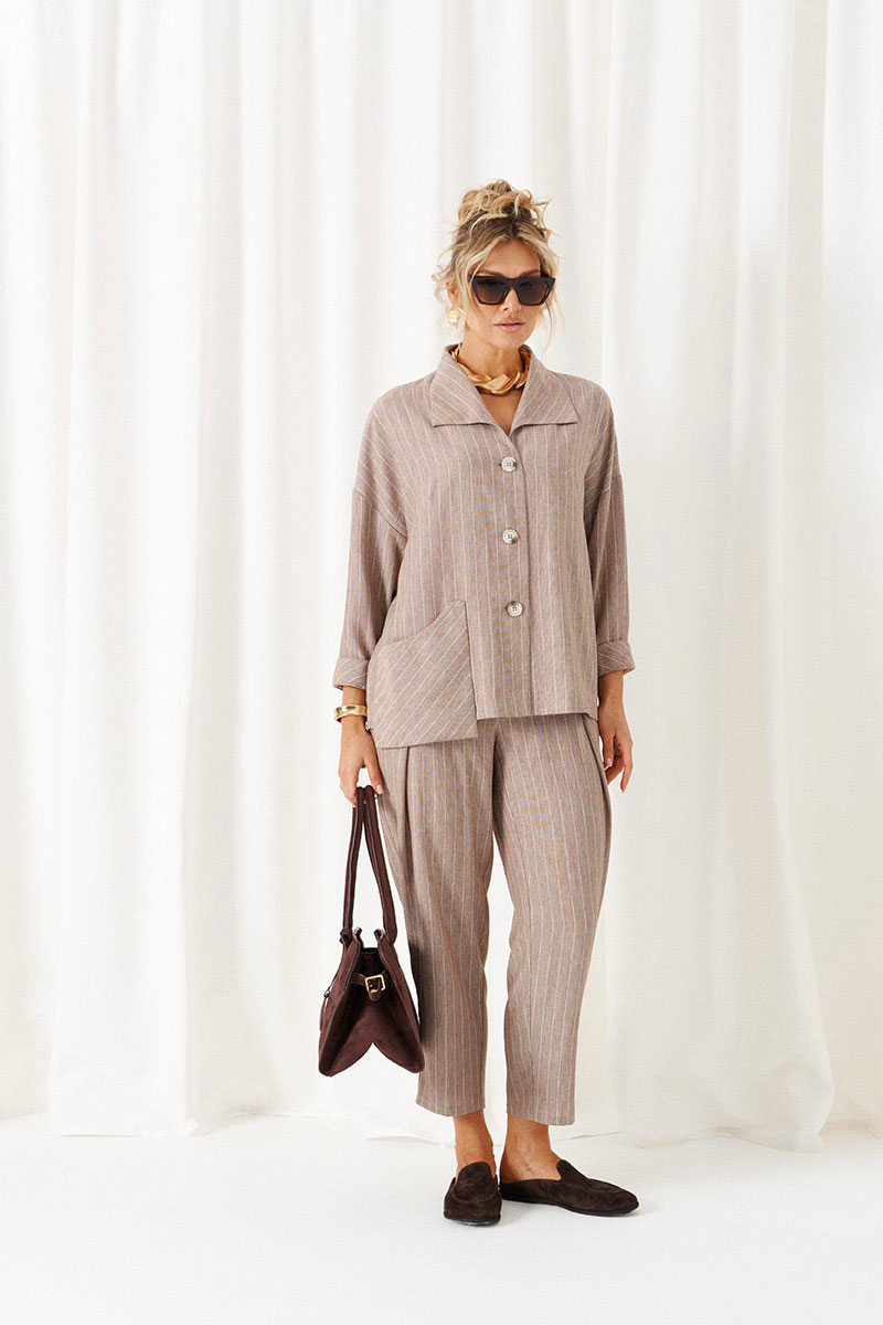 Костюм состоит из 2-х предметов одежды: рубашки и брюк. Выполнен из легкой ткани стильного дизайна с содержанием натуральных волокон.