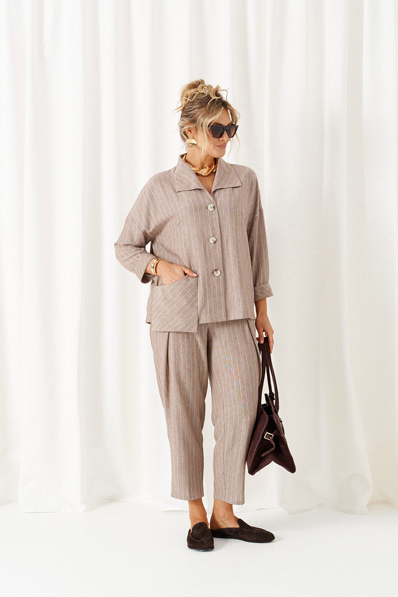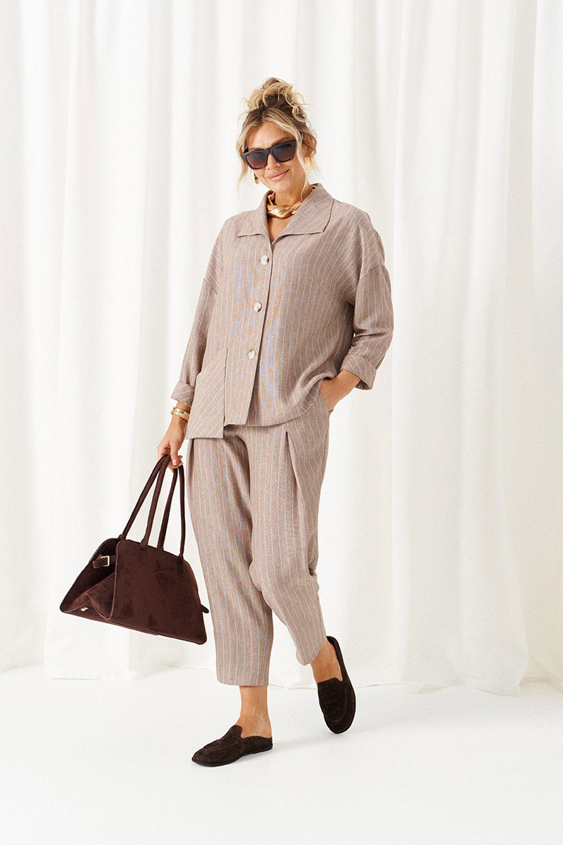 Брюки прямого силуэта свободные вверху и слегка зауженные к низу, длиной до щиколотки, с двумя верхними боковыми карманами и двумя заложенными глубокими складками от пояса спереди.