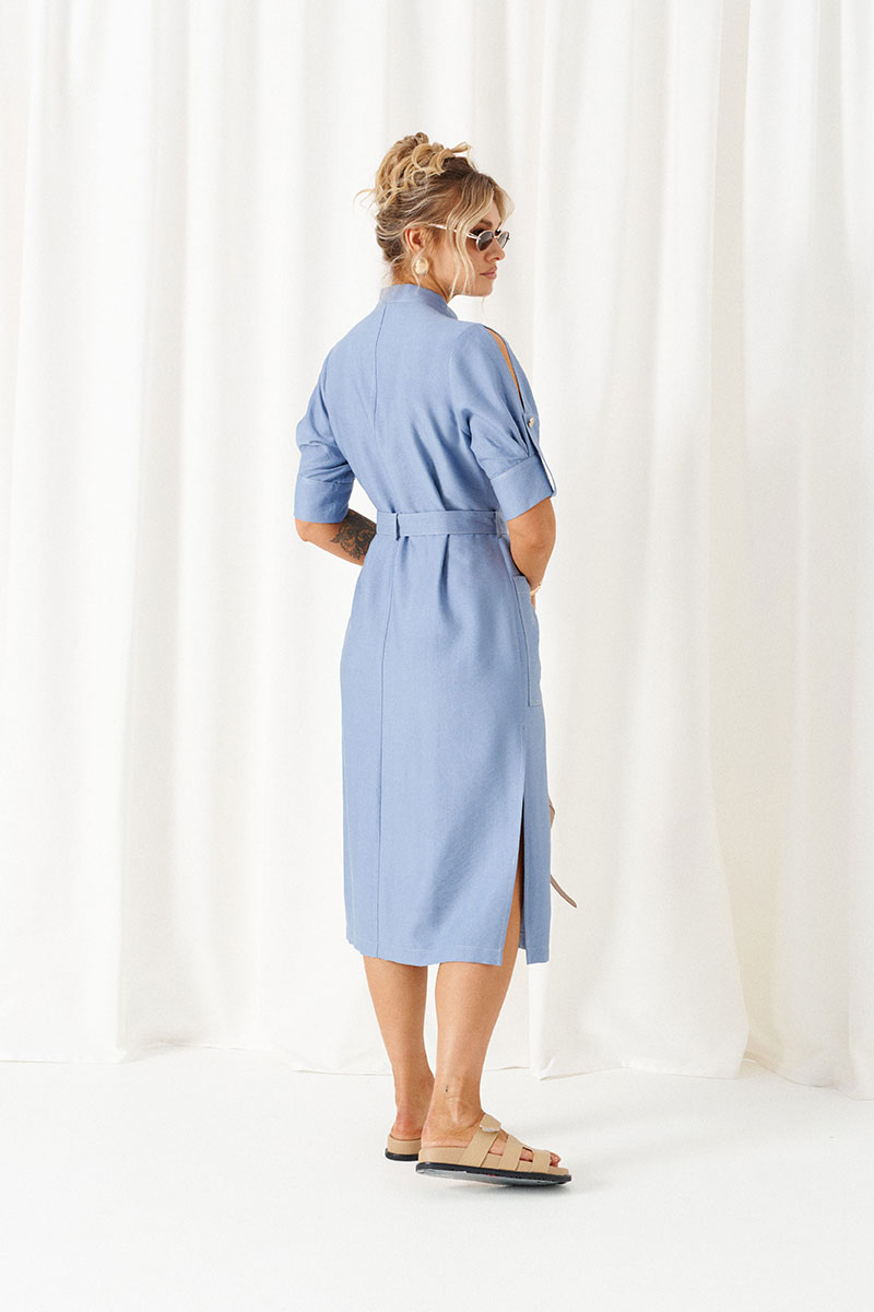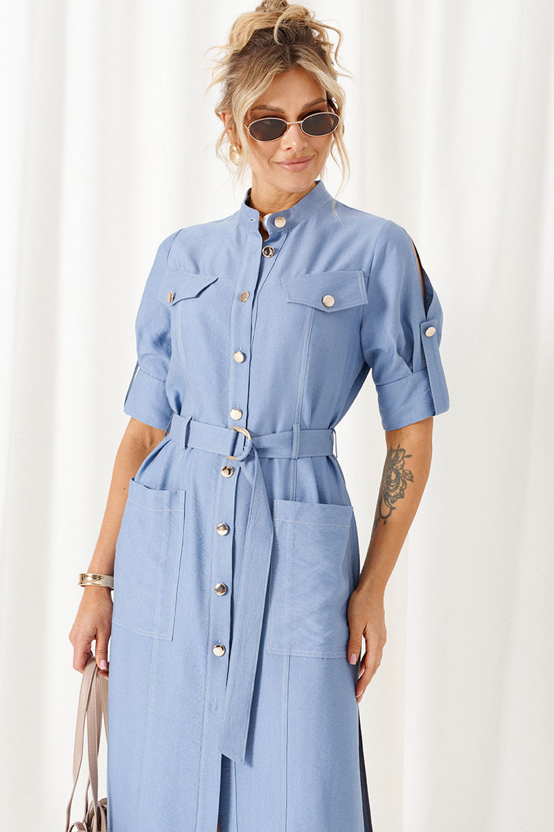 Платье женское полуприлегающего силуэта, длиной «миди», в строгом и практичном стиле «деним» из смесового полотна с натуральными волокнами – лен и вискоза.
