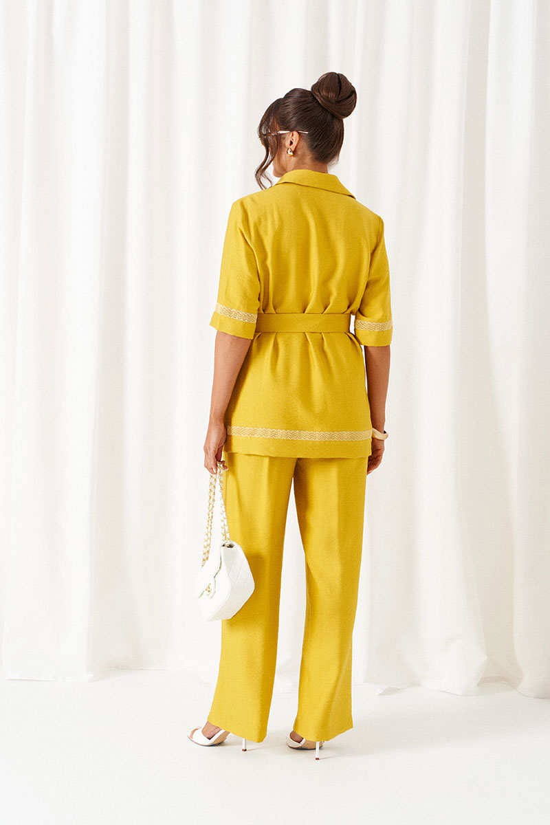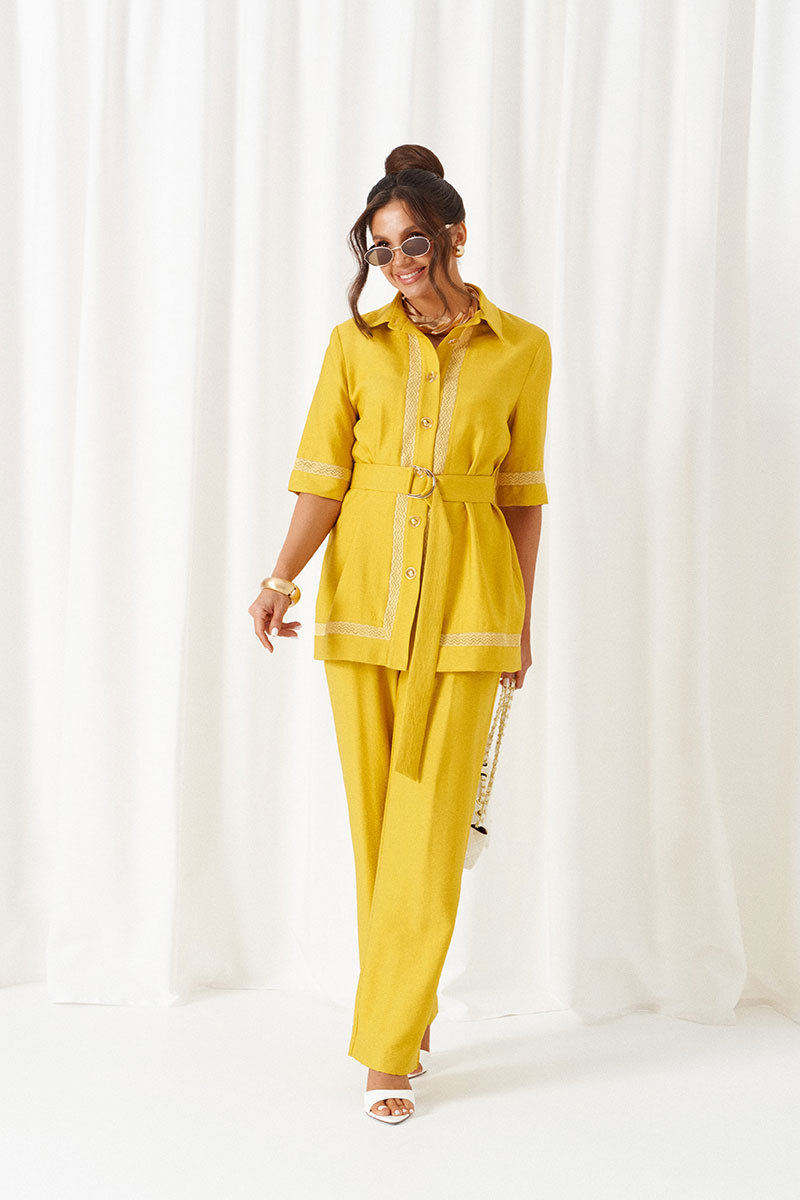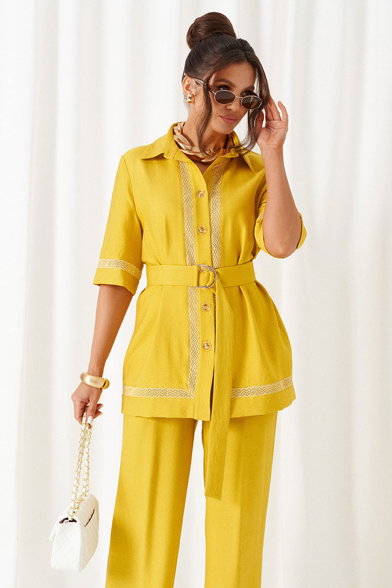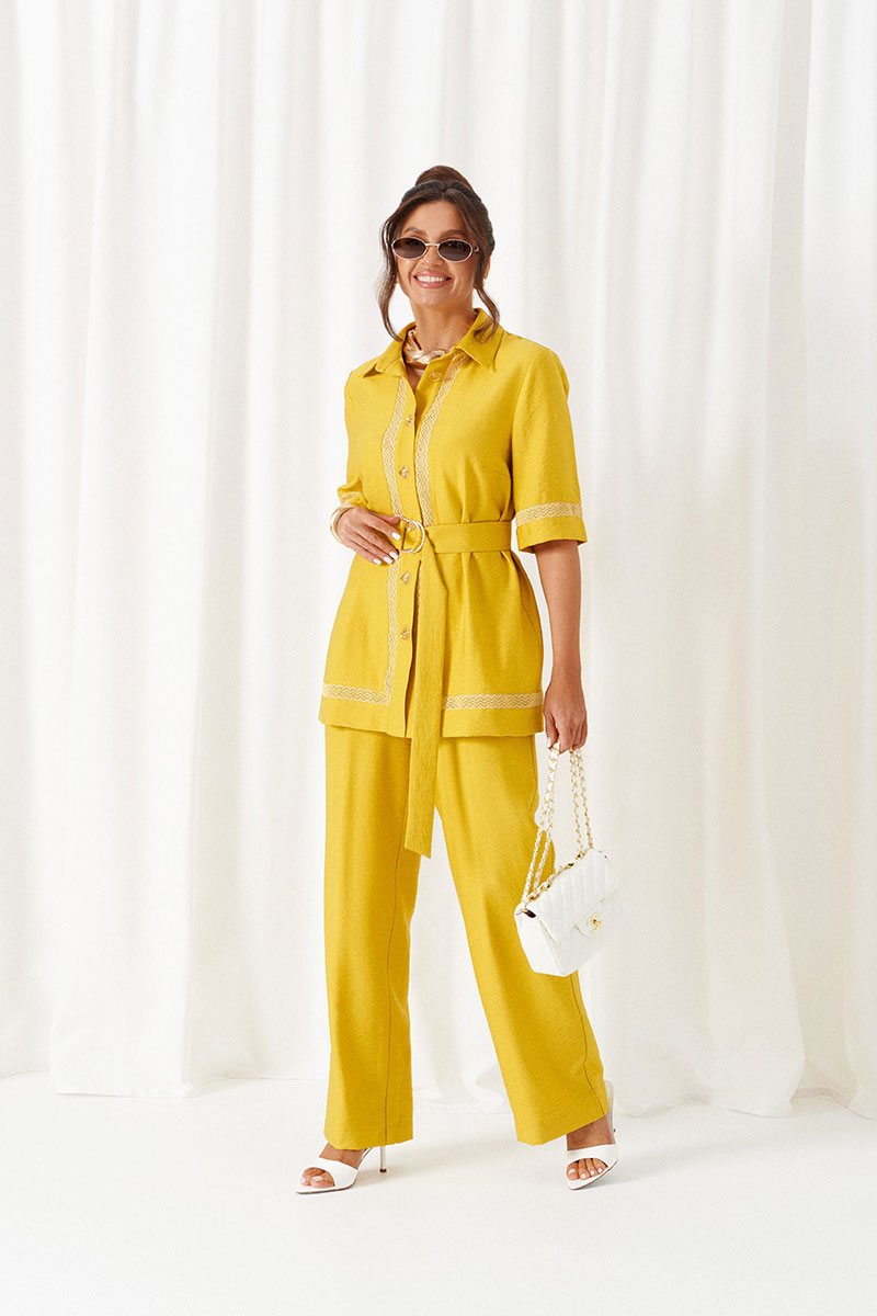 Стильный костюм состоит из блузы и брюк, выполнен из мягкой ткани с волокнами льна и вискозы, практичен в носке.