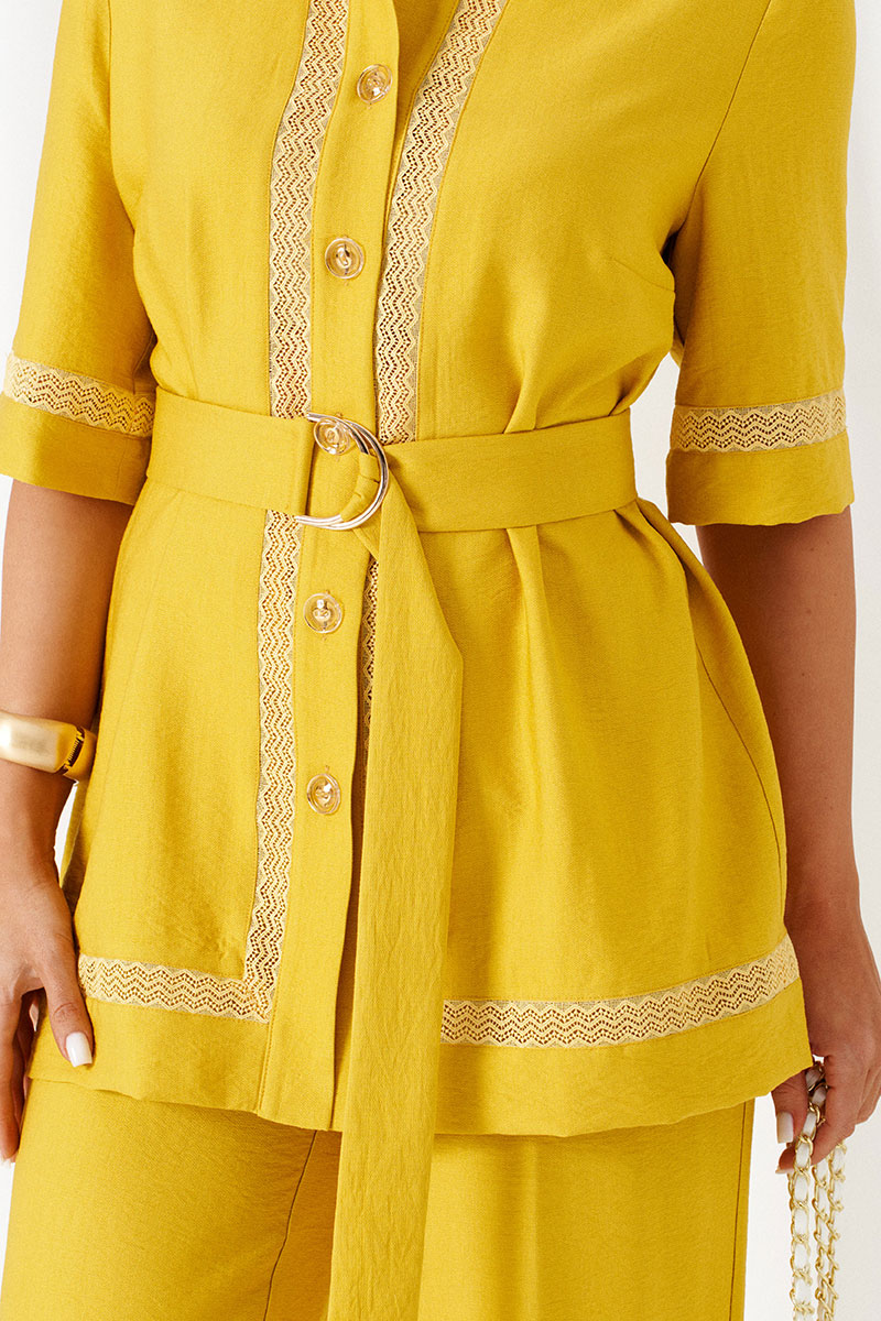 Блуза полуприлегающего силуэта, длиной до середины бедра с пояском-завязкой.