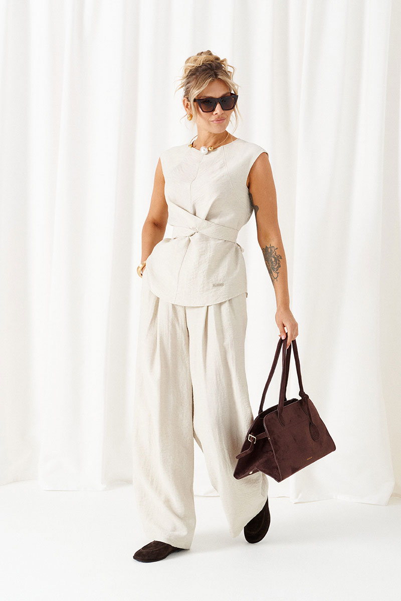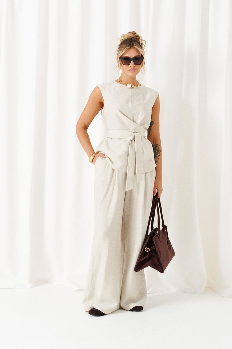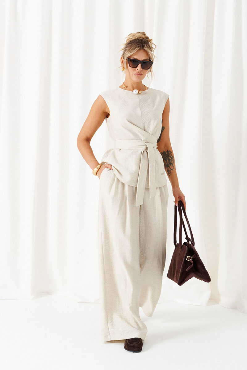 Костюм состоит из 2-х предметов одежды: блузки и брюк. Выполнен из ткани с содержанием натуральных волокон льна и вискозы.