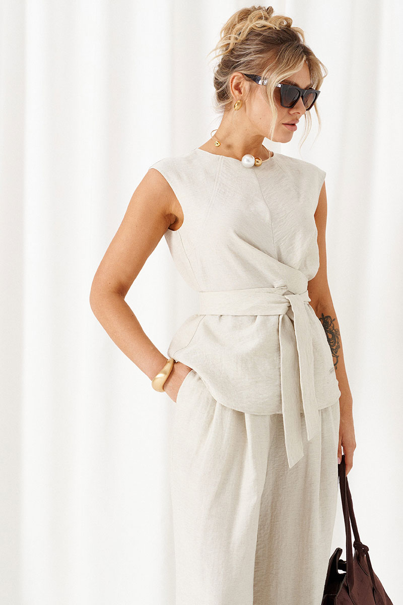 Блузка полуприлегающего силуэта свободного кроя, со слегка удлиненной линией плеча, без рукава. Индивидуальность изделию придает цельнокроеная деталь, выполняющая роль пояса-завязки, который перекручиваясь создает красивый узел спереди и фиксирует талию.