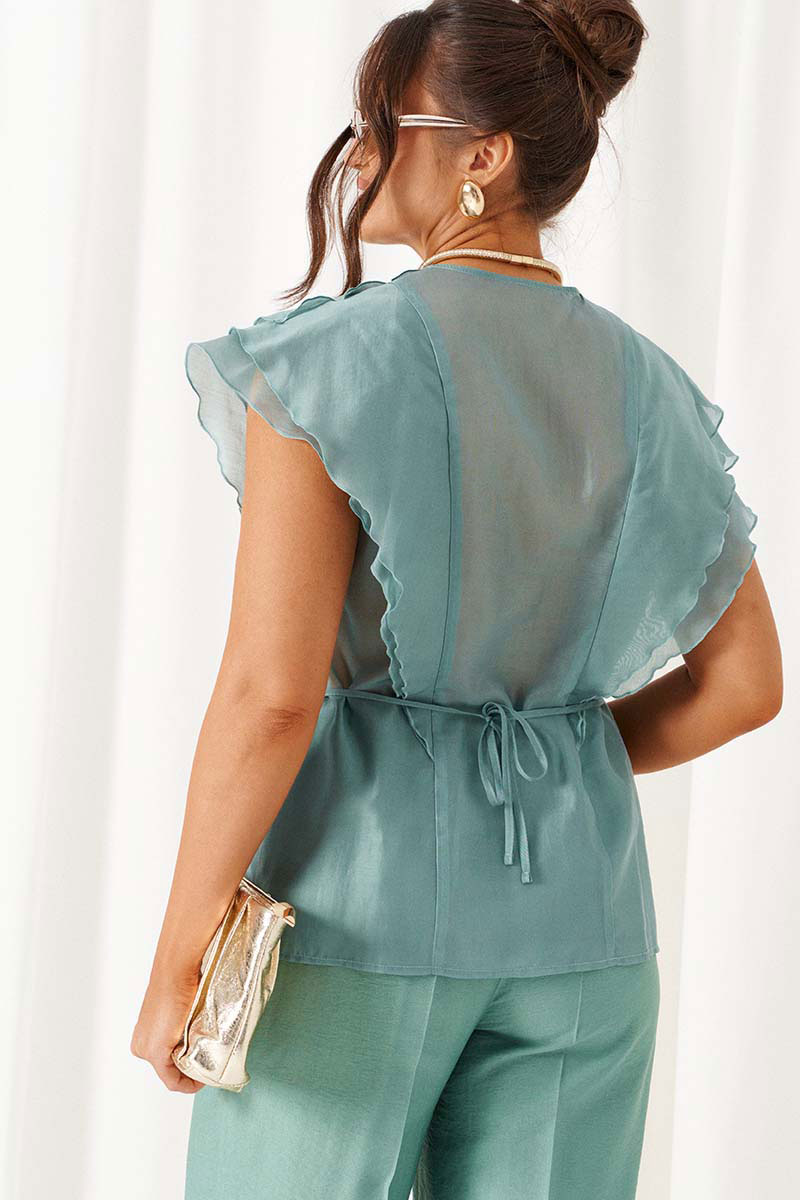 Блузка полуприлегающего силуэта выполнена из смесовой ткани с содержанием вискозной нити, дополнена несъемным пояском-завязками, которые регулируют прилегание по талии.