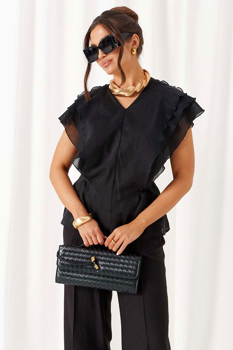 Передняя часть симметричная, разрезная по центру и с вертикальными рельефами от плеча, спрятанными под тремя воланами разной ширины.