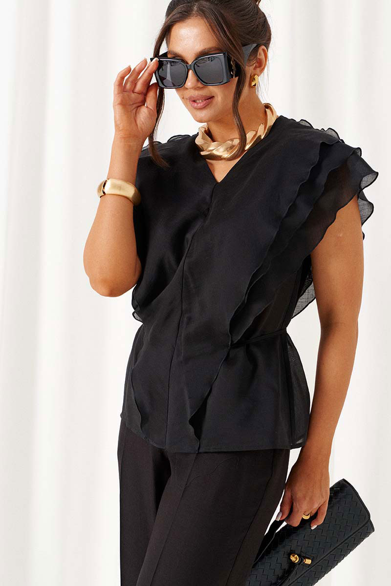 Блузка полуприлегающего силуэта выполнена из смесовой ткани с содержанием вискозной нити, дополнена несъемным пояском-завязками, которые регулируют прилегание по талии.