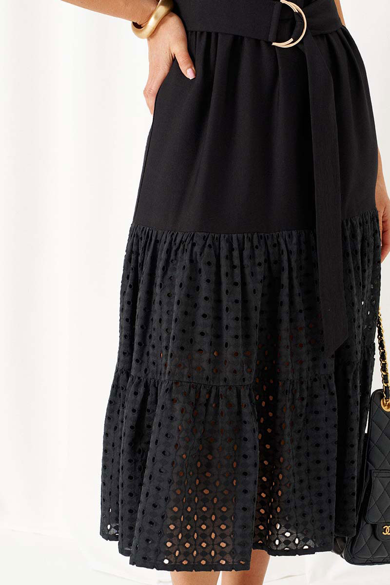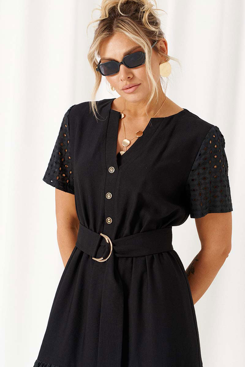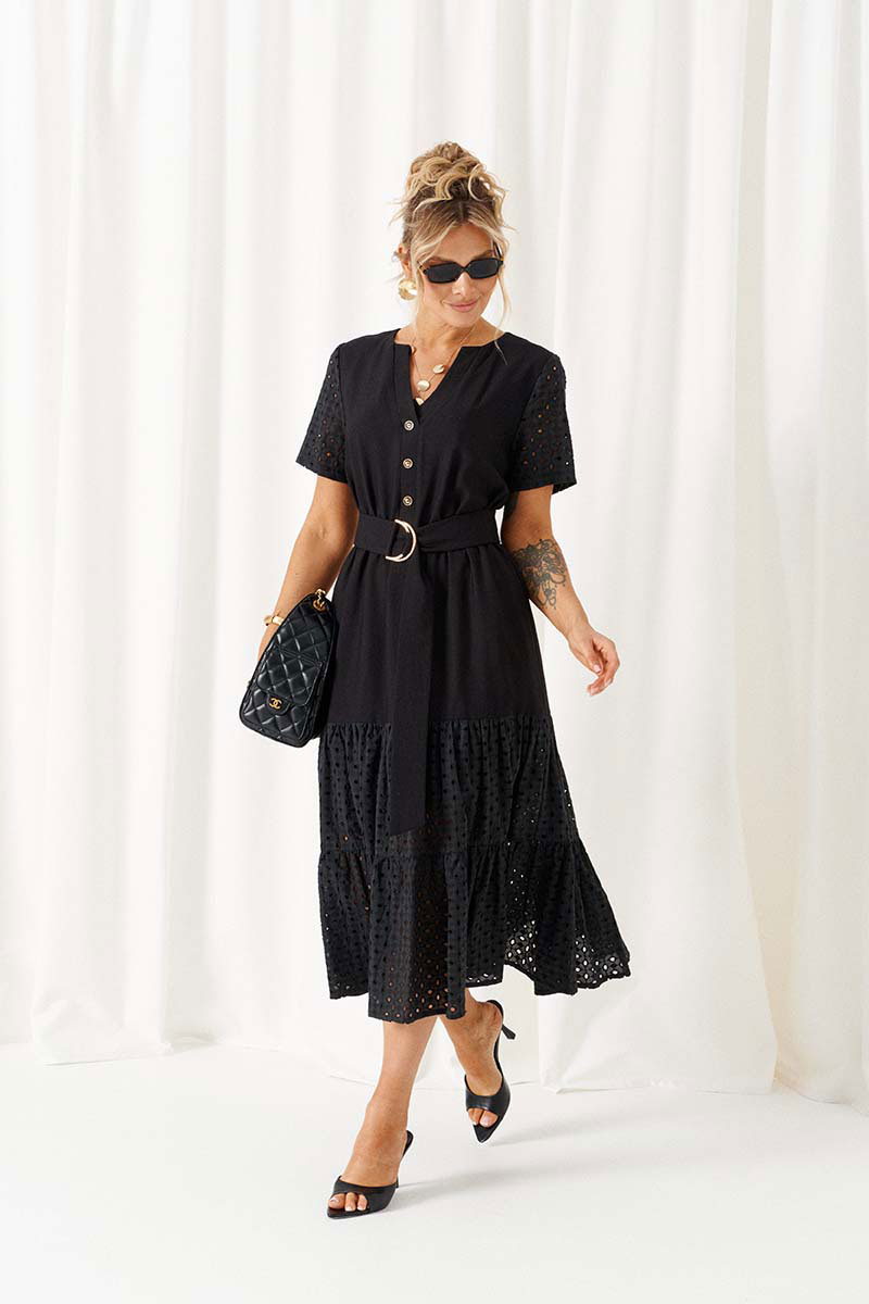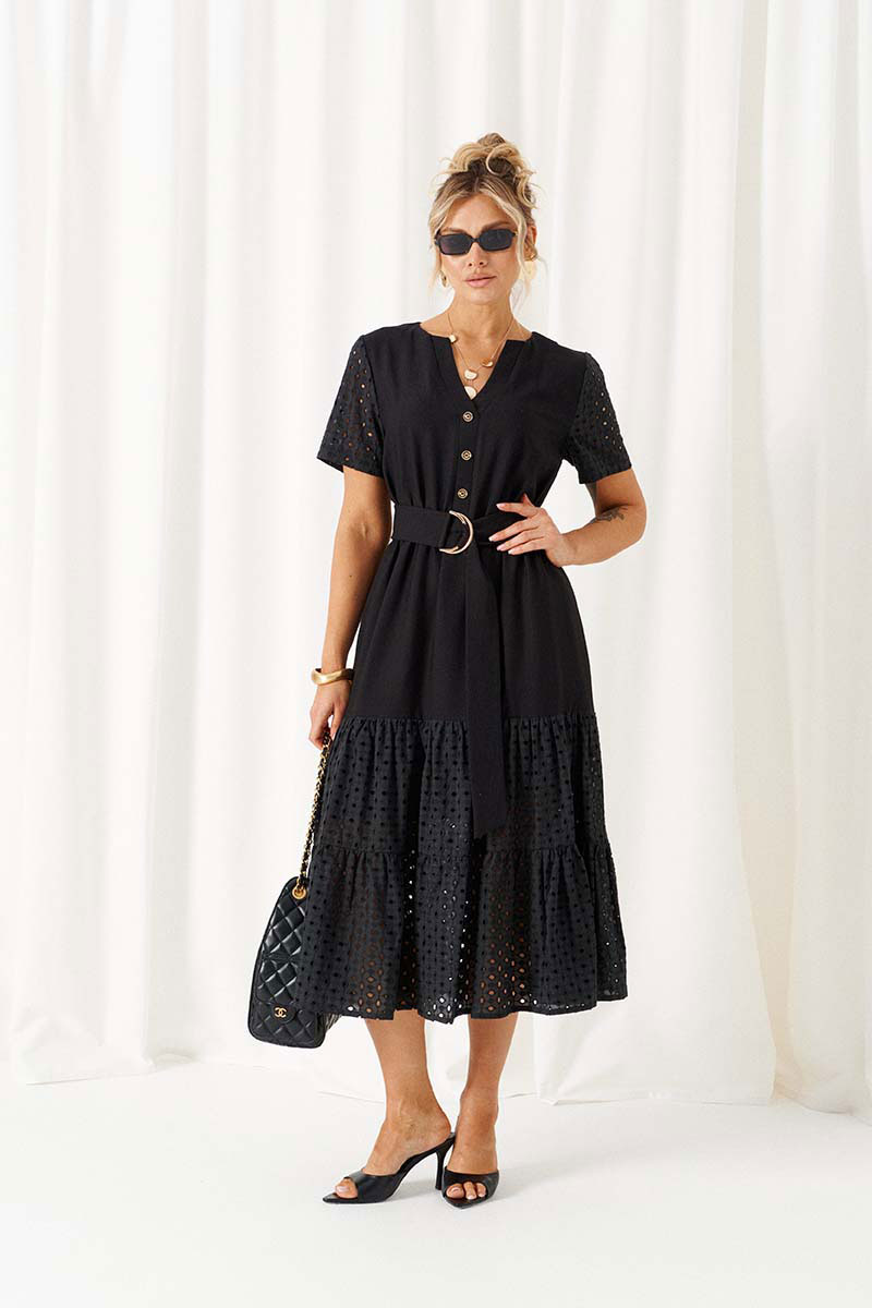 Платье полуприлегающего силуэта, длинное, на хлопковой подкладке, отрезное по линии талии, дополнено поясом с декоративной пряжкой.