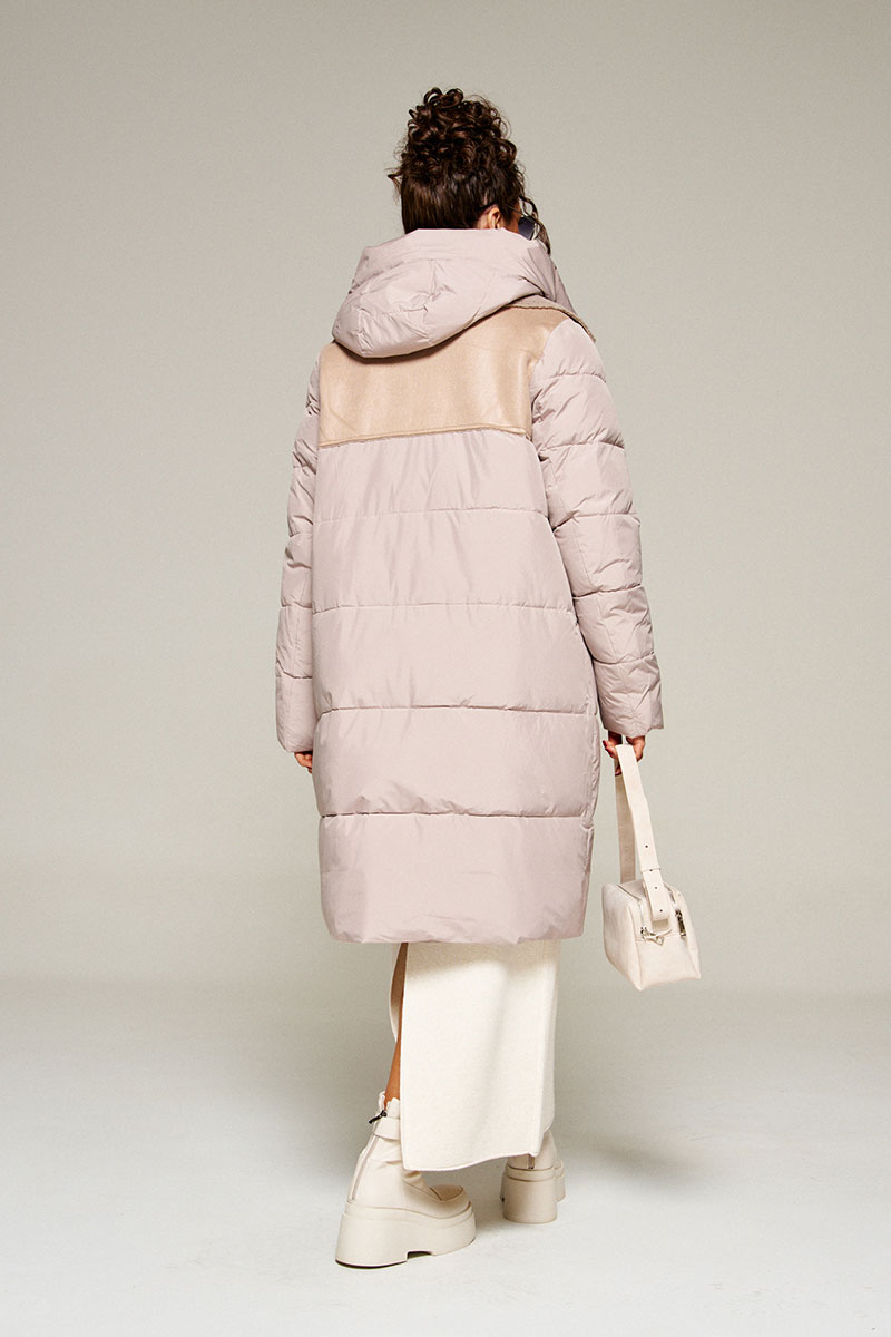 Перед с подрезной кокеткой из экокожи и с симметричными боковыми прорезными карманами с широкой обтачкой, фиксируемые на кнопку. На правом кармане выполнен декоративный элемент в виде широкой репсовой тесьмы. Центральная вставка переда, переходящая в воротник, выполнена из двусторонней экокожи, где внутренняя сторона – искусственный мех «овчина».