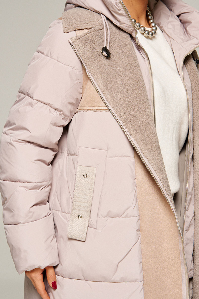 Капюшон с манишкой съемный (на потайных пуговицах) умеренного объема с дополнительной двусторонней застежкой молнией по центру. По периметру капюшона протянут шнур в цвет изделия с декоративными металлическими фиксаторами.