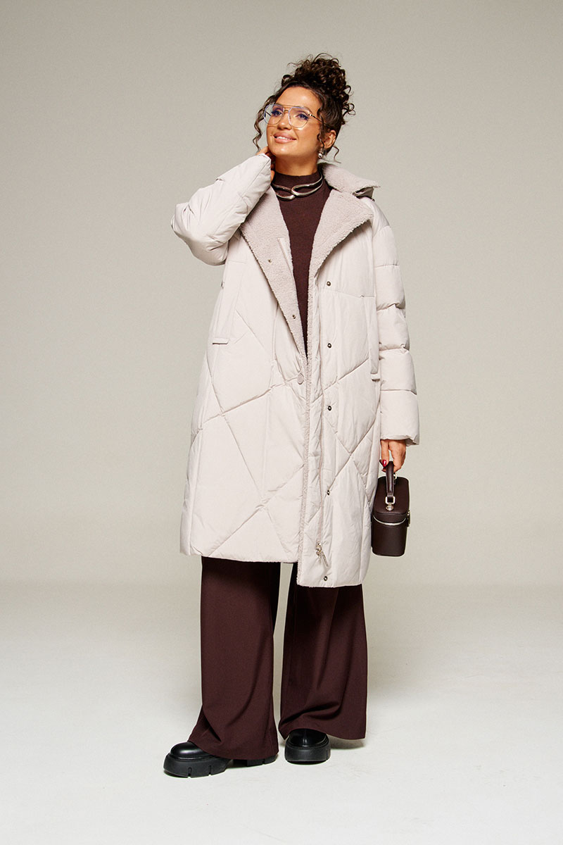 Воротник пиджачного типа с возможностью застегивания до верха. Внутренняя часть воротника, борта и лацканы обработаны искусственным мехом «овчина».