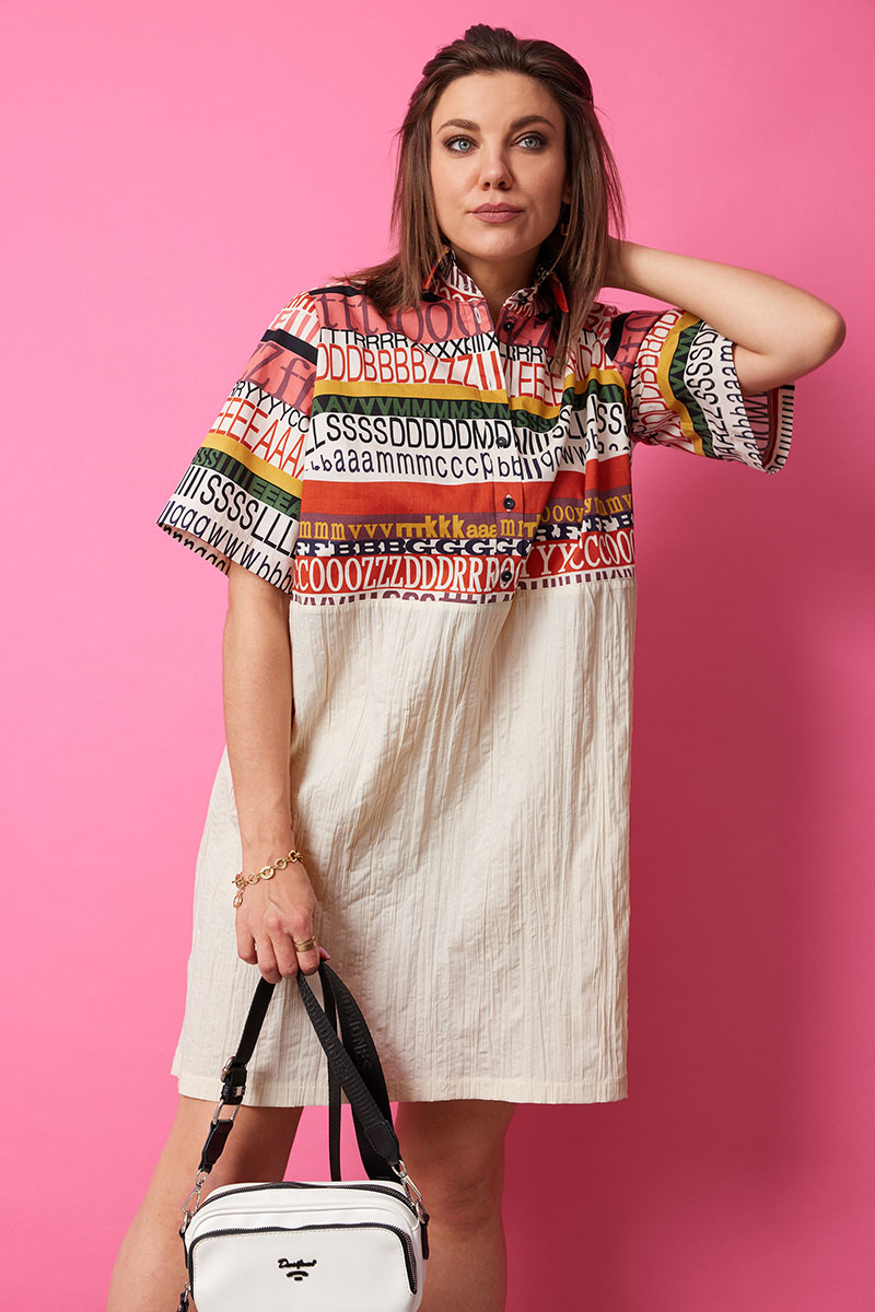 Предлагаем Вам оригинальное трендовое платье прямого кроя. Оно смотрится современно и ярко благодаря сочетанию приятного к телу хлопкового текстиля с эффектным текстовым принтом и текстиля - жатки. Это идеальный выбор для стильных и модных женщин. Такая модель позволит Вам чувствовать себя на все 100%, где бы Вы ни находились.