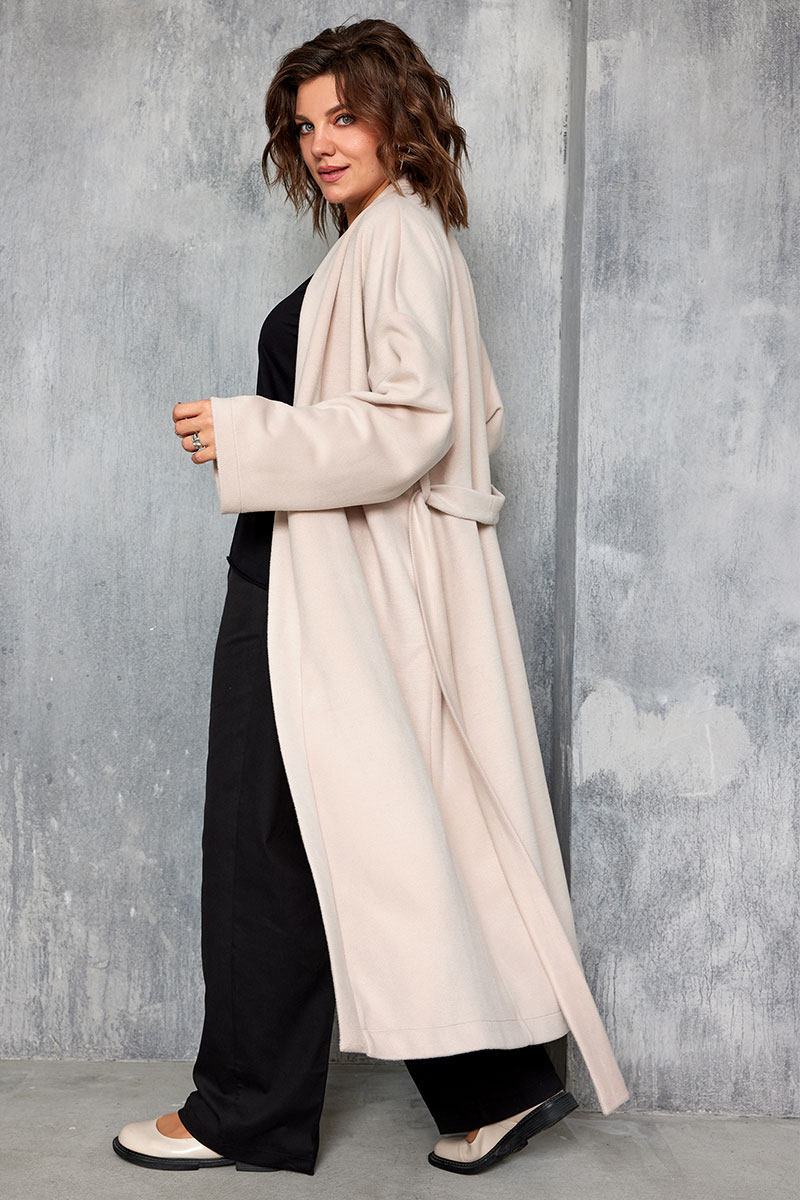 Рукав со спущенной проймой. В районе талии шлёвки для фиксации пояса. В комплекте съёмный пояс. Низ кардигана обработан в подгибку.
