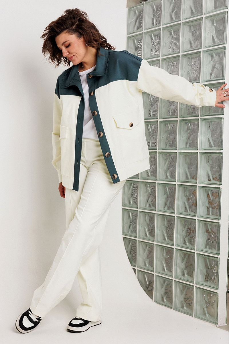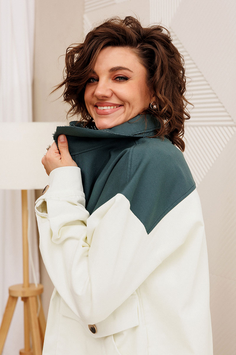 Контрастные детали кокетки, воротника и планки бомбера выполненные из джинсовой ткани - являются изюминкой модели, приковывают к себе внимание и являются стильным