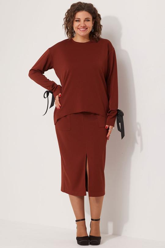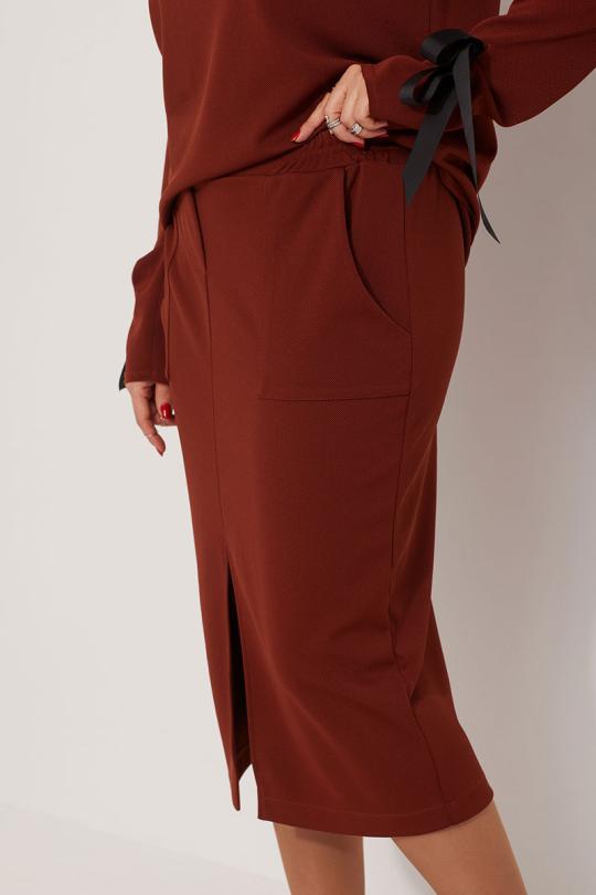 Невероятно уютный, универсальный трикотажный комплект, состоящий из свитшота и юбки - это решение для каждой модницы, ценящей современные, лаконичные образы. Такой комплект идеален для офиса, а так же в нём можно провести приятный вечер в любимом кафе с друзьями либо надеть в театр. Сочетание практичности и элегантности позволяет всегда быть на высоте, не жертвуя при этом комфортом. Фасон комплекта позволяет грамотно прорисовывать нужные линии и скрывать недостатки фигуры.