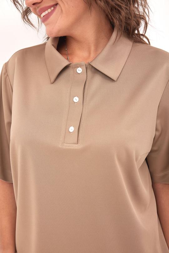 Блуза-поло свободного кроя с отложным воротником на планке. Визуально удлиняет линию шеи. Рукав втачной с подгибкой по линии низа. На спинке в районе плеча расположены вытачки. В боковых швах - разрезы, обработанные подгибкой. Спинка длиннее переда.