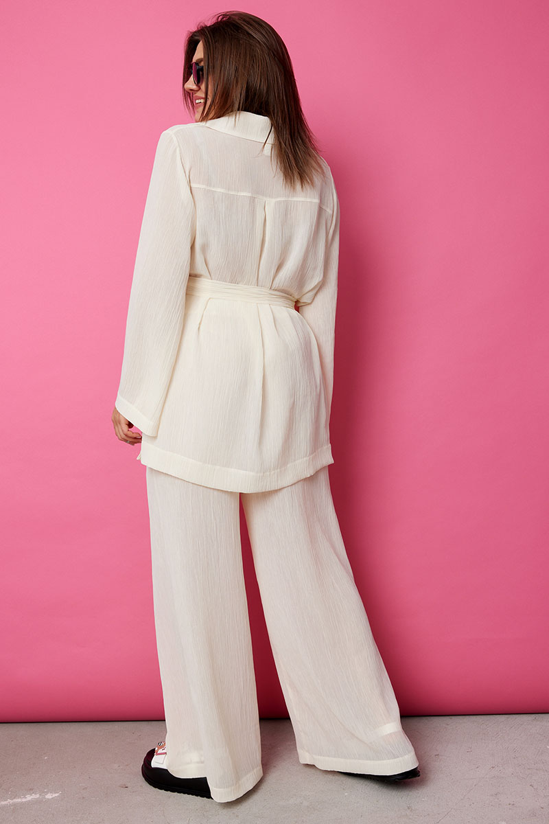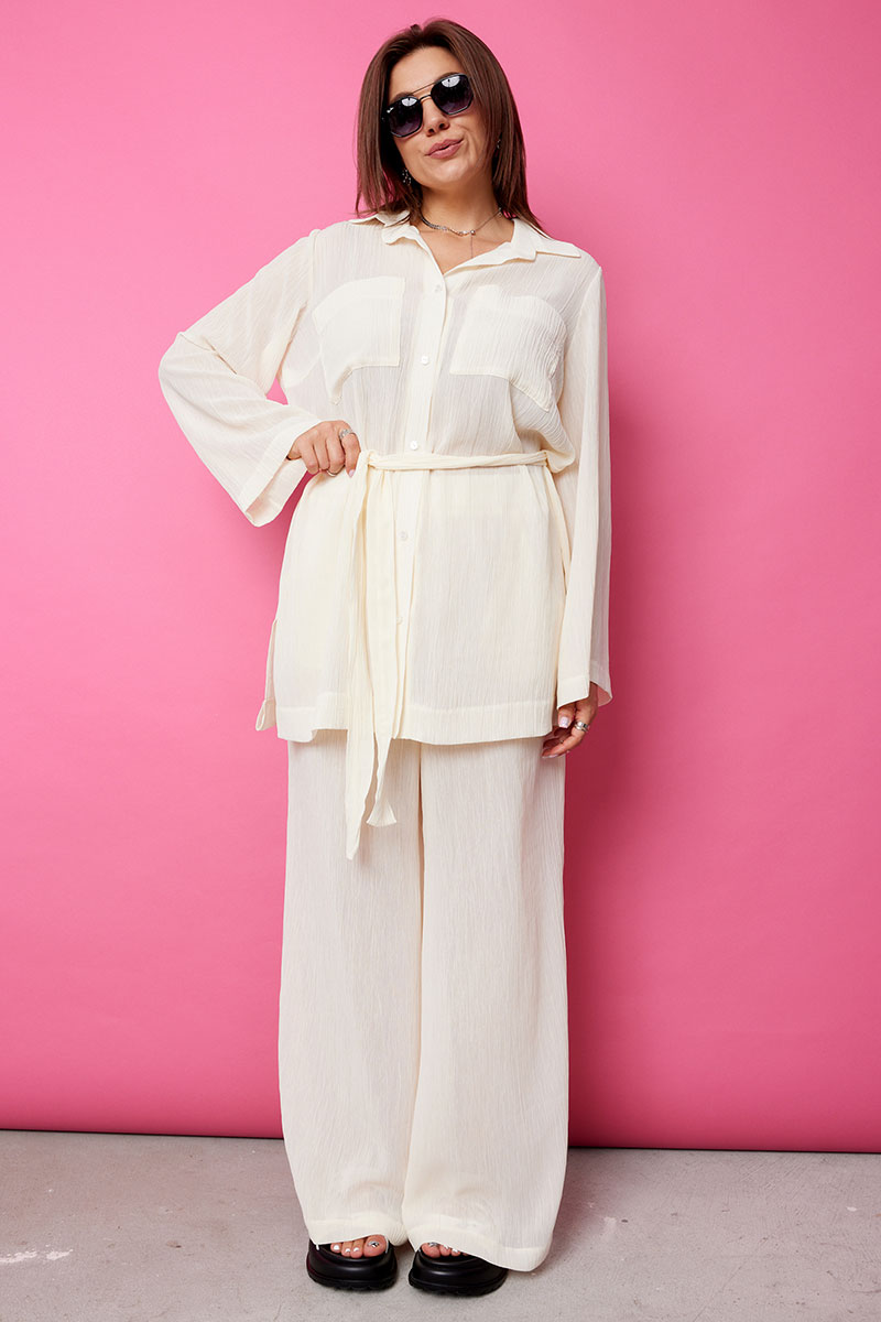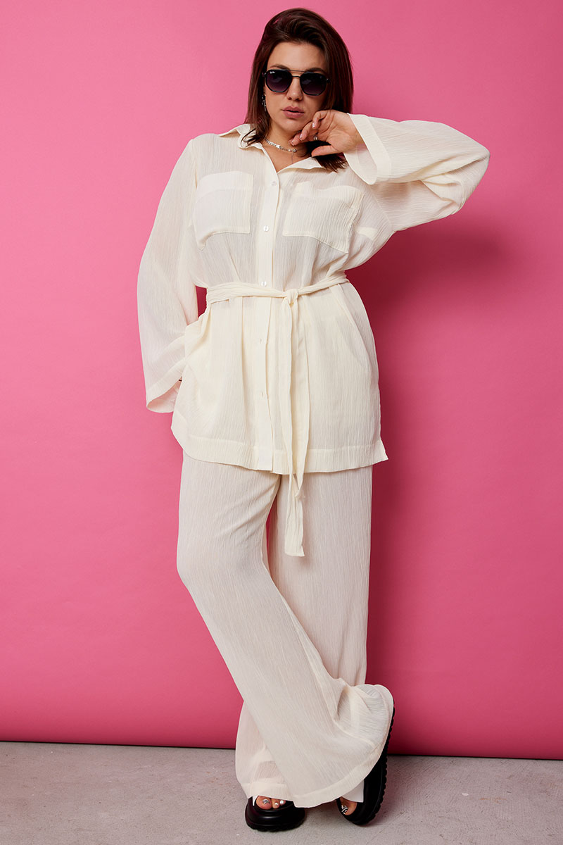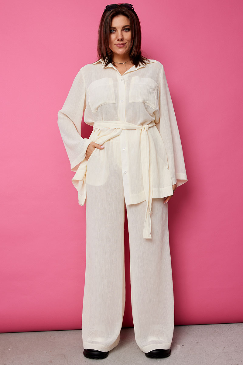Восхитительный комплект, позволяющий собрать множество комплиментов, состоящий из блузы и брюк палаццо, является классикой современного стиля. Трендовая двойка позволяет вытянуть силуэт, акцентировать внимание на достоинствах фигуры, скрыв её недостатки. Нежный полупрозрачный текстиль обеспечит комфорт в жаркие летние дни. Тканевая фактура жатки не нуждается в дополнительном уходе, элегантный крой комплекта привлечёт к Вам восхищённые взгляды окружающих и в то же время позволит чувствовать себя комфортно.