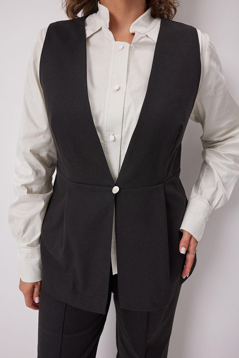 Жилет приталенного силуэта, без подкладки с застёжкой на металлическую пуговицу. Посадка по фигуре идеальна благодаря выверенным лекалам. Акцент на талии создают односторонние складки