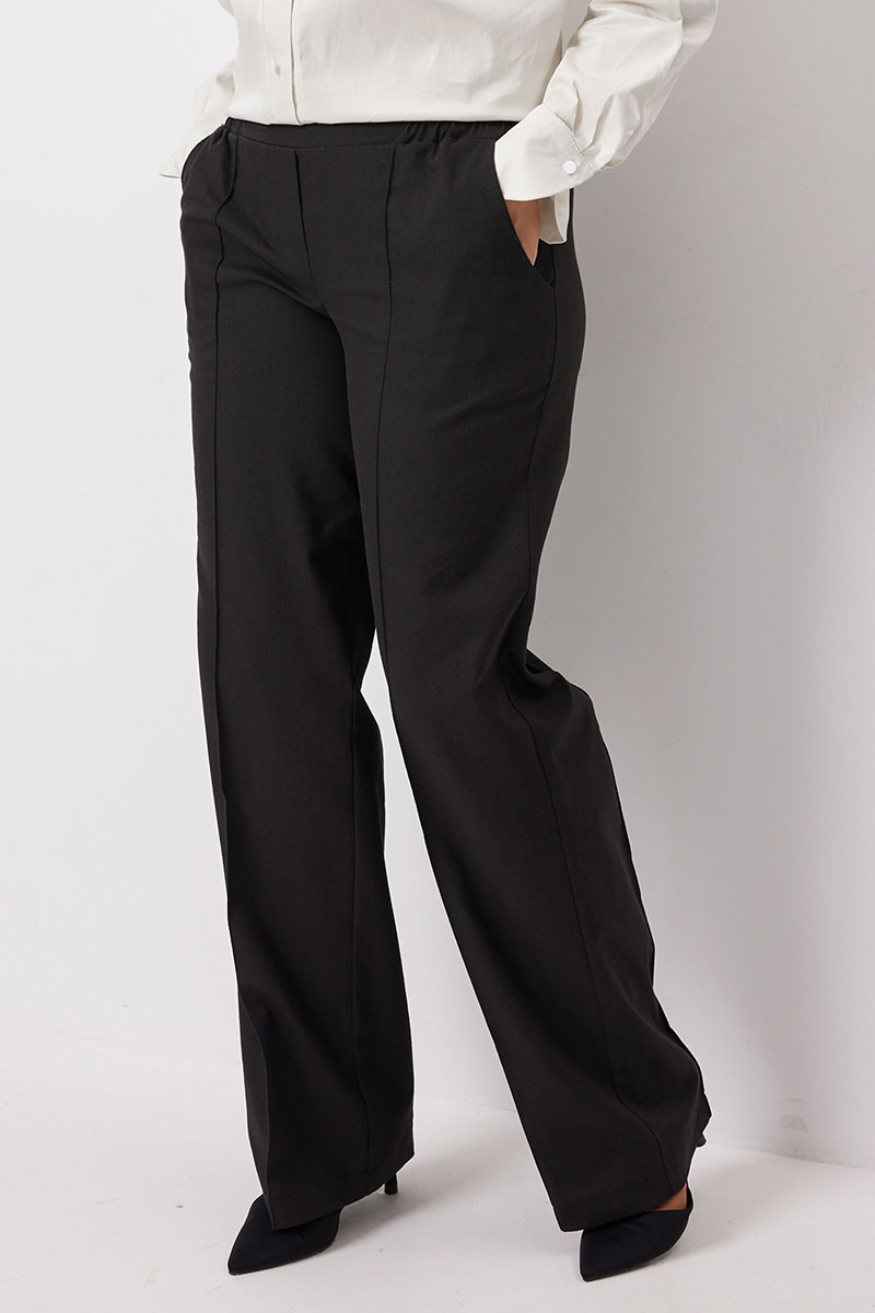 Брюки прямые с застроченными стрелками для удлинения ног. Пояс на резинке, с островком для Вашего удобства. По бокам - карманы хулиганы. Низ брюк обработан подгибкой.