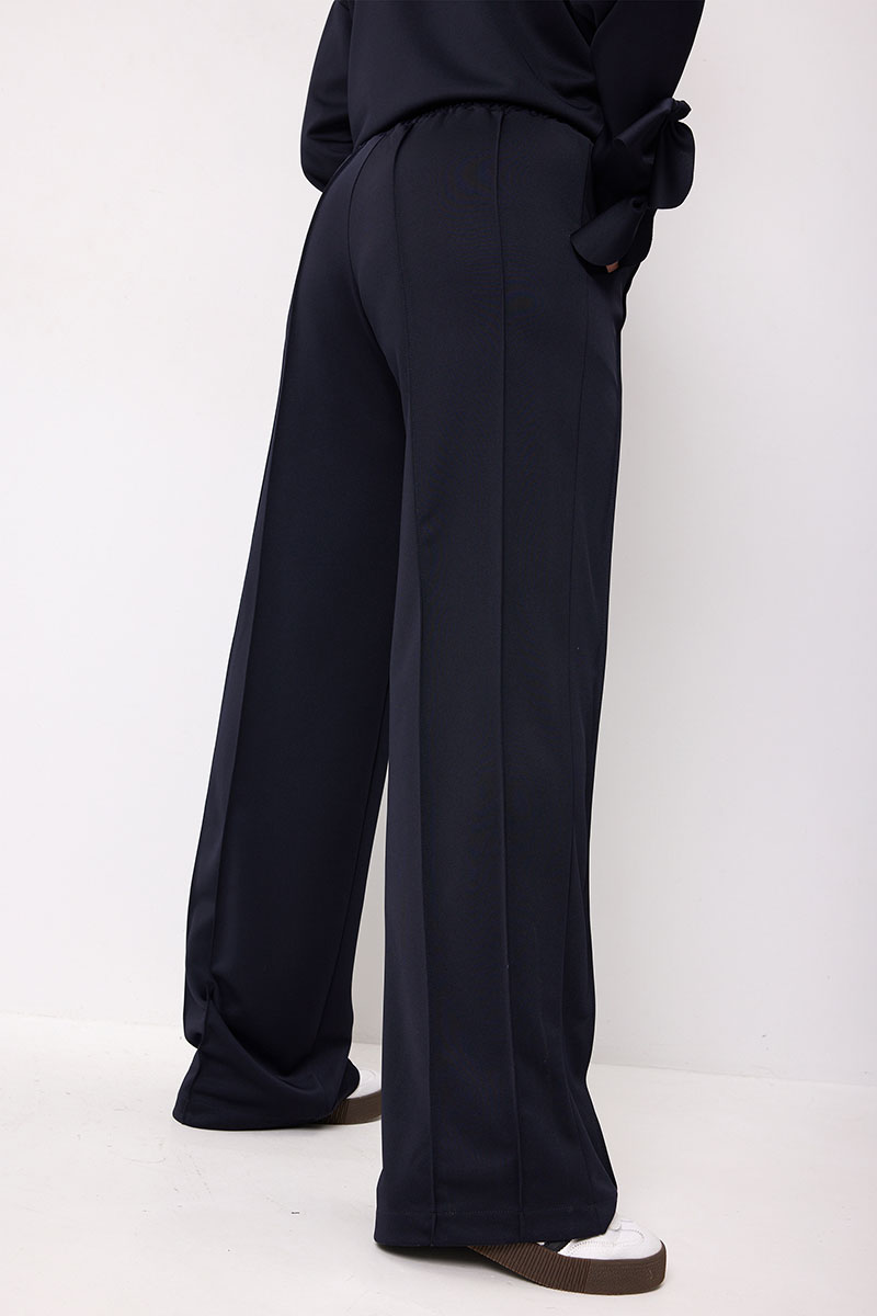 Брюки свободного кроя с притачным поясом на резинке с островком. Спереди и сзади расположены две застроченные стрелки. Это конструктивное решение для идеальной посадки по фигуре. Низ