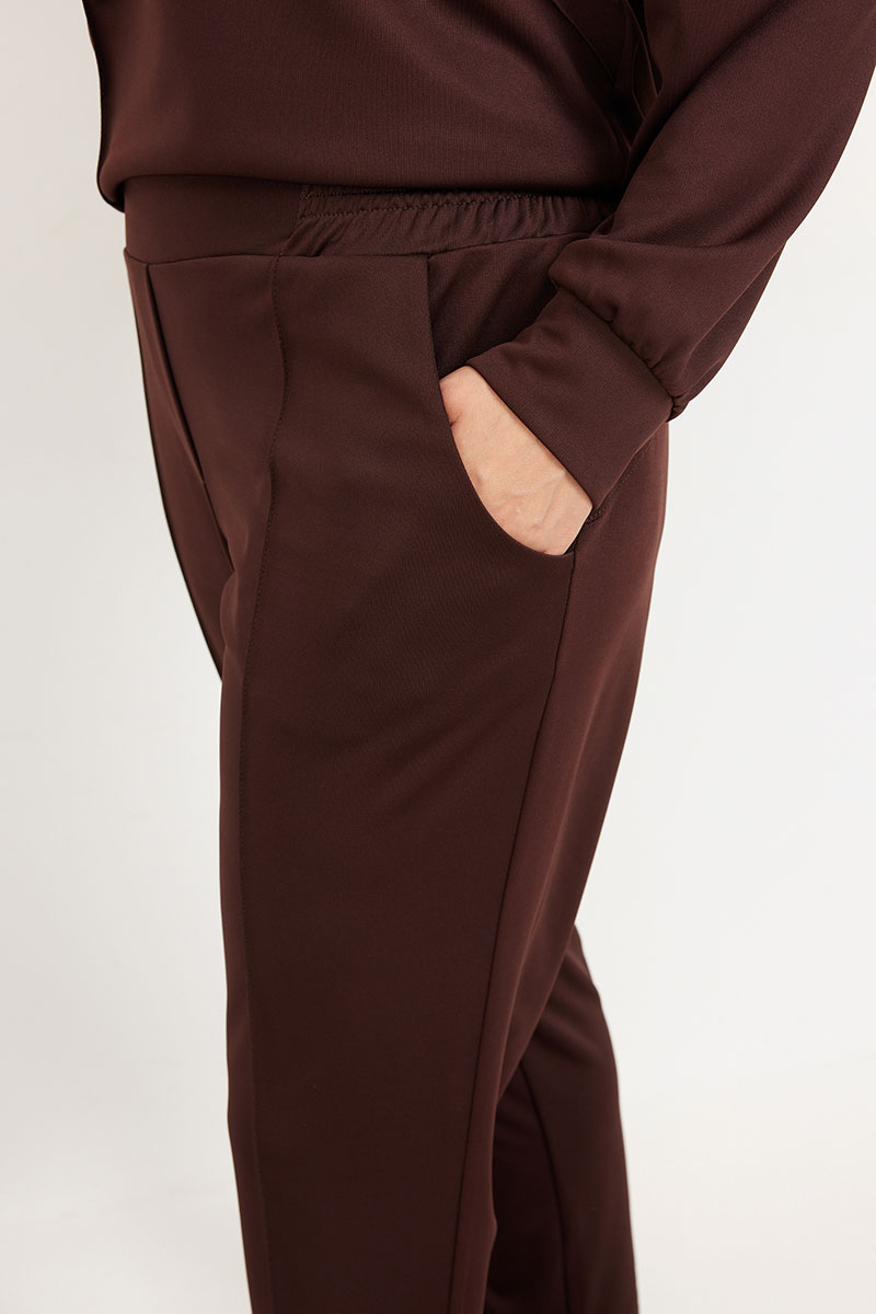 Брюки полуприлегающего силуэта, с застроченной стрелкой по линии переда. Пояс на резинке с островком для Вашего удобства. В боковых швах карманы «Хулиганы». Низ обработан классическим