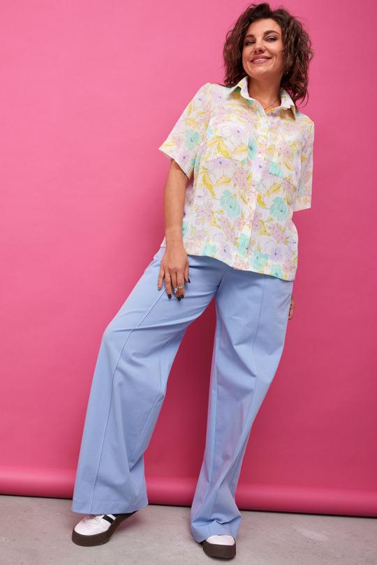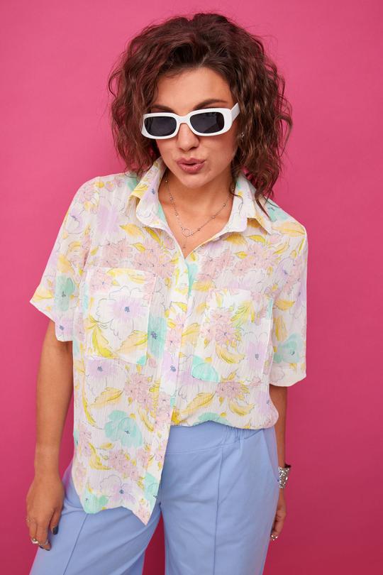 Блуза свободного кроя выполнена из лёгкой, струящейся текстильной ткани. Нежный, воздушный, не мнущийся материал с эффектом жатки с акварельным цветочным узором прекрасно освежает образ и позволит собрать множество комплиментов в Ваш адрес. Лекала выполнены таким образом, что позволяют модели «сидеть» идеально, подчеркнув достоинства фигуры и скрыть недостатки.