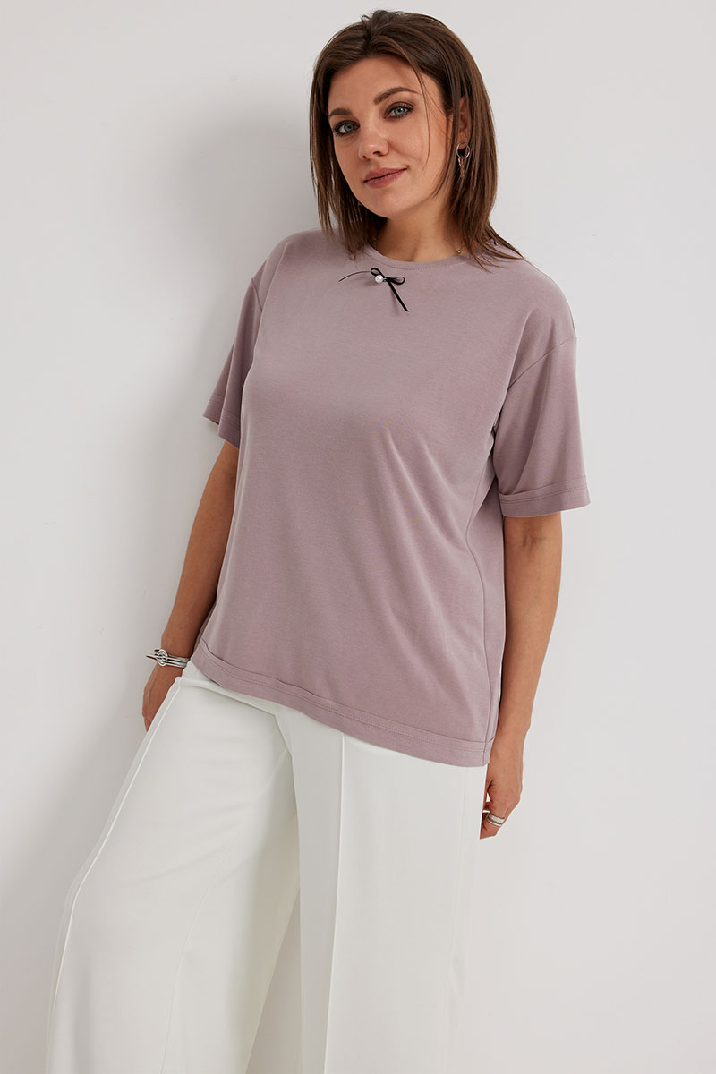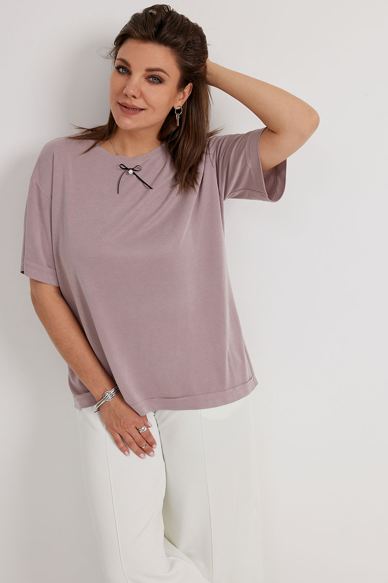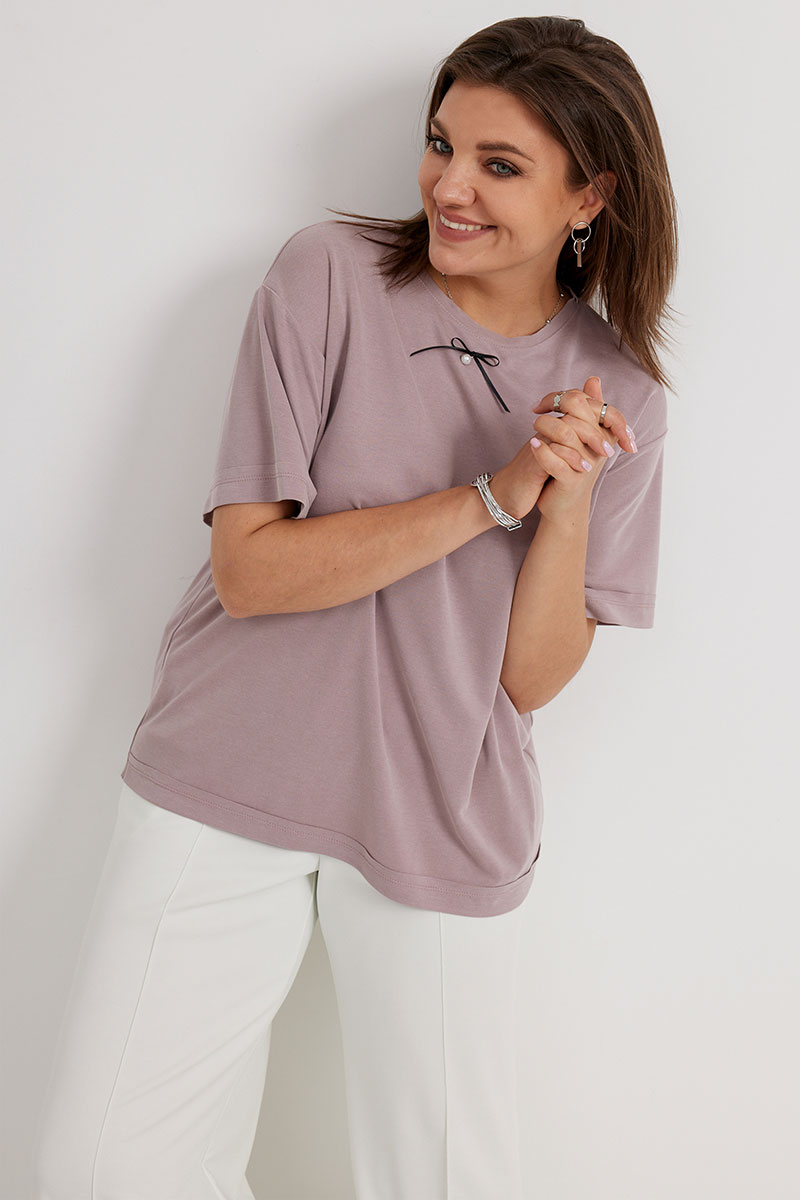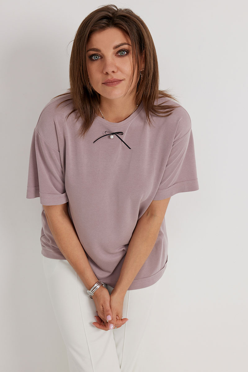 по низу. По передней части блуза декорирована бантом из тонкой атласной ленты и жемчужной бусиной. Низ втачного рукава и низ изделия оформлены подворотом наружу.