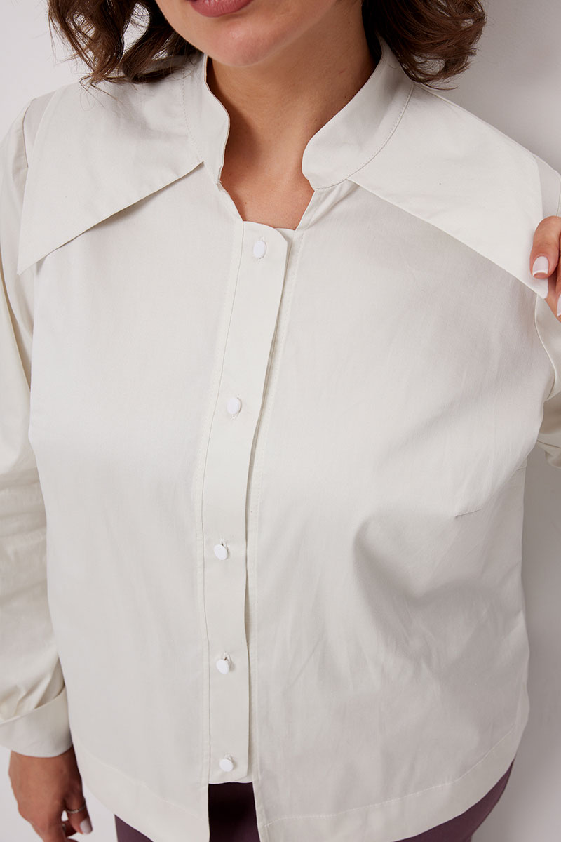 Блуза прямого кроя с воротником стойкой и декоративным деталями в виде отложного воротника , на планке с застёжкой на петли- пуговицы, с нагрудными вытачками. Рукав втачной на