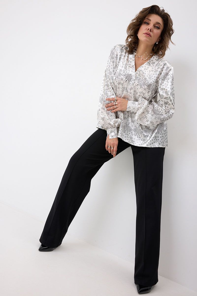 Блуза свободного кроя. Передняя часть на притачной планке, имеющей застёжку на петли-пуговицы. V-образный вырез формирует красивое декольте.