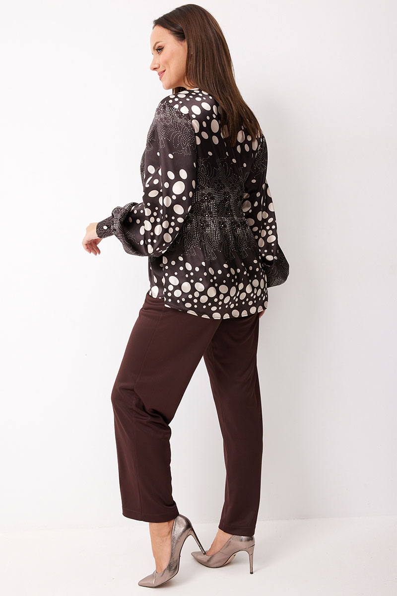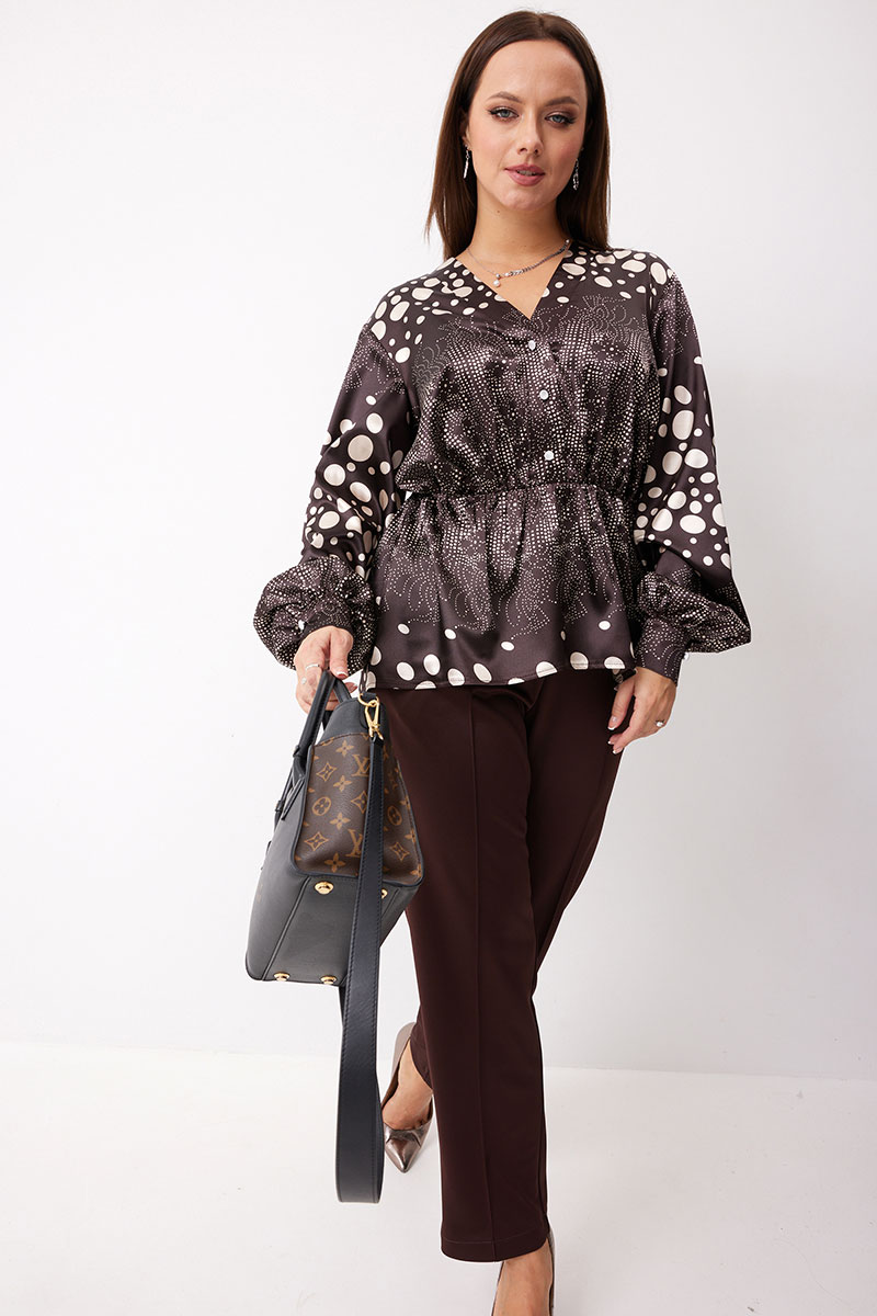 Блуза свободного кроя. Передняя часть на притачной планке, имеющей застёжку на петли-пуговицы. V-образный вырез формирует красивое декольте.