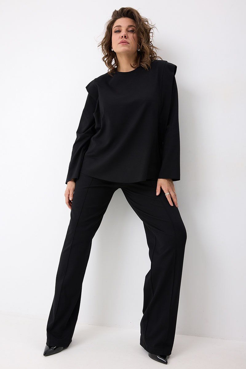 Лонгслив свободного кроя. Горловина обработана обтачкой с открытым срезом. Низ рукава и низ изделия имеют открытые срезы. На плечах металлические декоративные зажимы