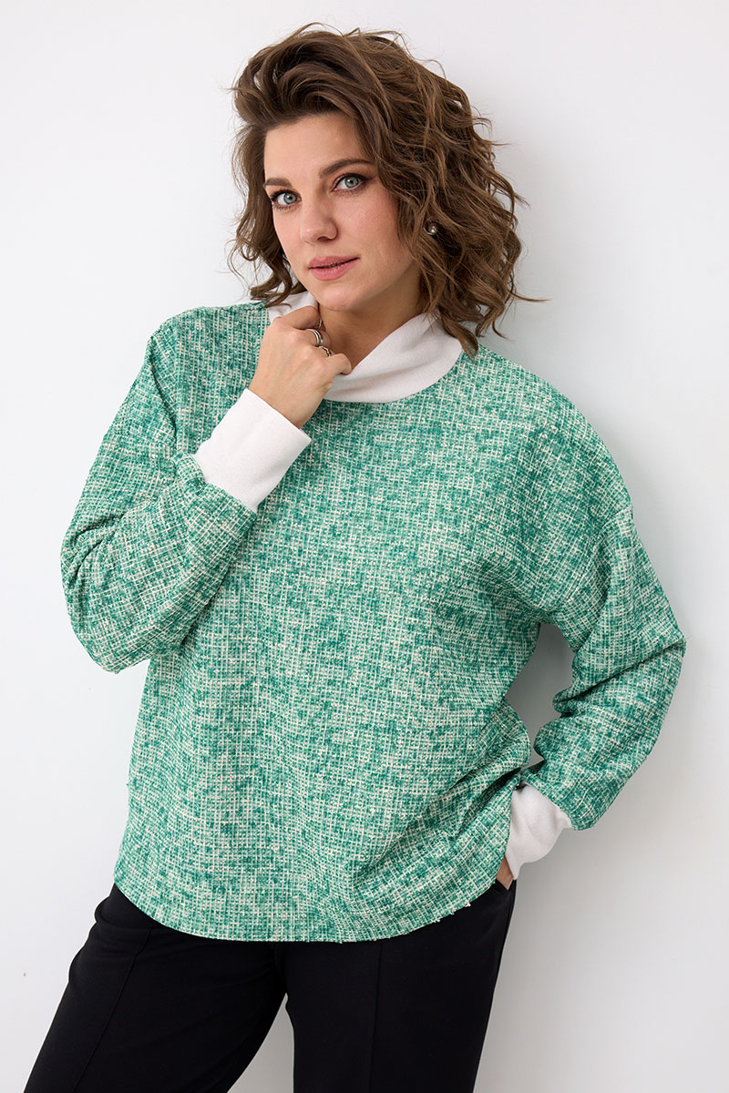 Лонгслив свободного кроя, рукав втачной, линия плеча спущена. Горловина и манжеты выполнены из мягкого средней плотности трикотажа контрастного цвета.