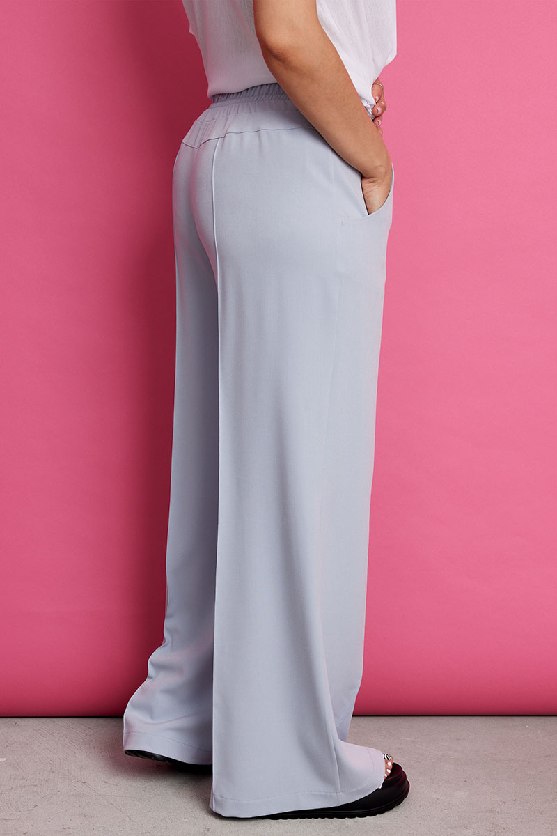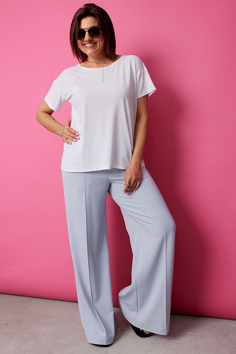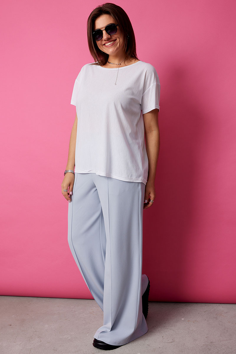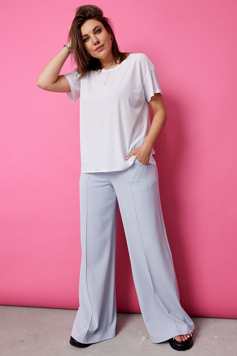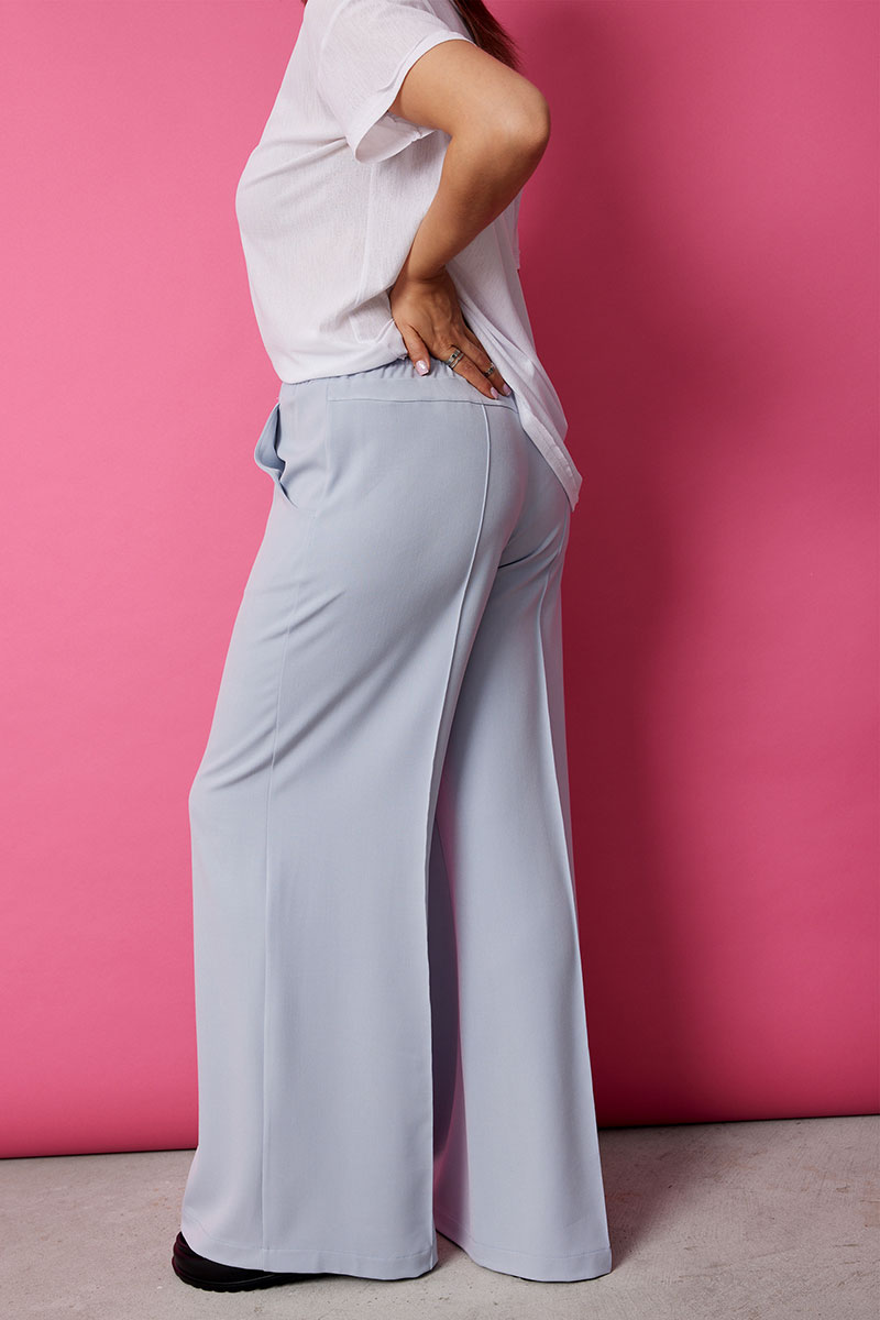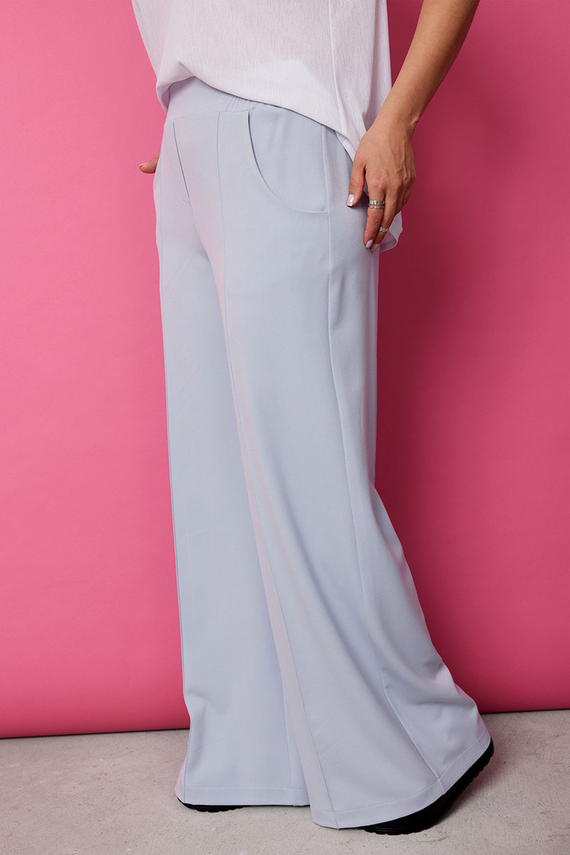 Невероятно комфортные, элегантные брюки палаццо в нежном голубом оттенке, покорят Вас с первого взгляда. Струящийся мягкий текстиль нежно обнимает ваши ноги, позволяя коже дышать и даря ощущение свободы. Широкий крой палаццо добавляет образу легкость и непринужденность, а застроченные стрелки визуально удлиняют силуэт.