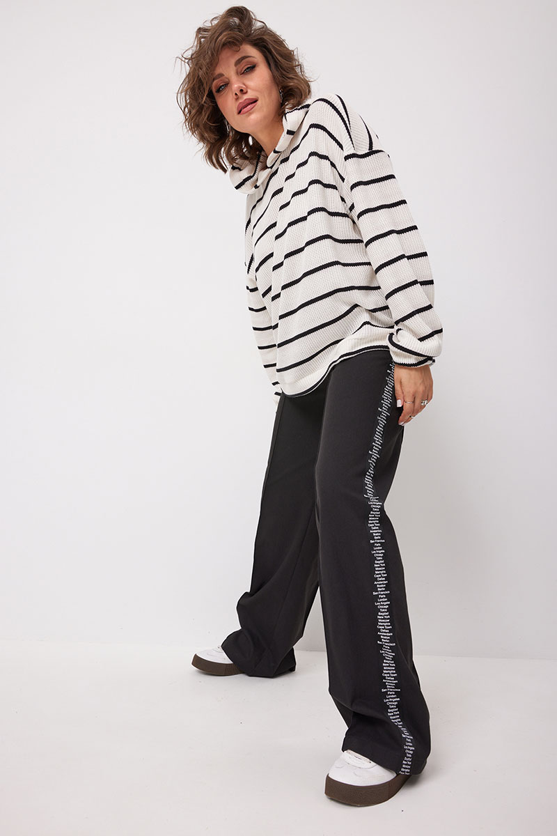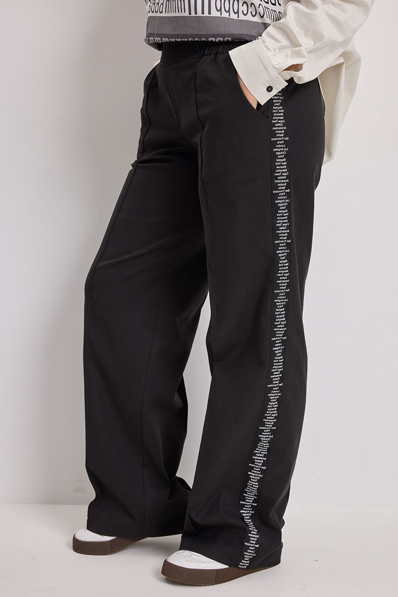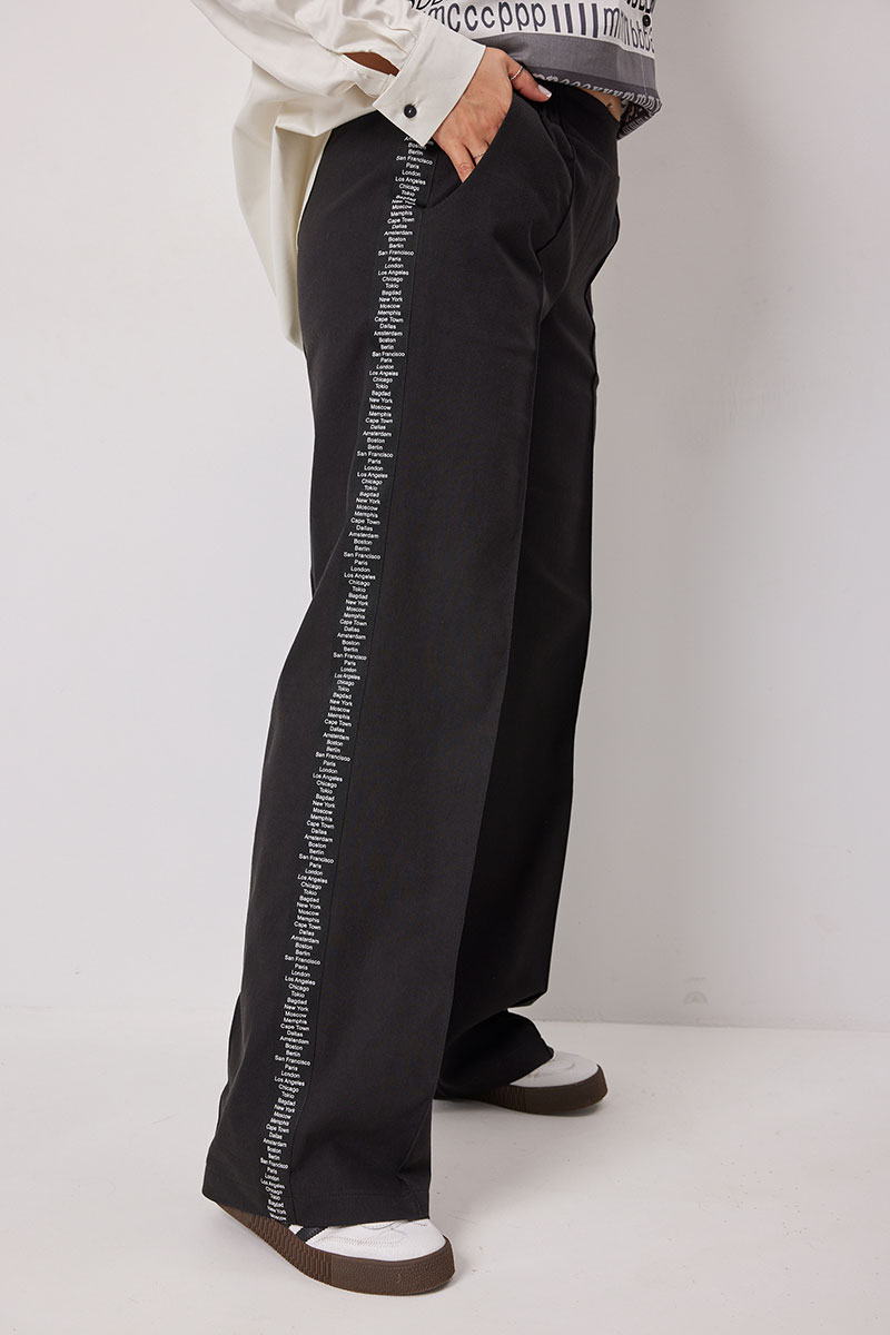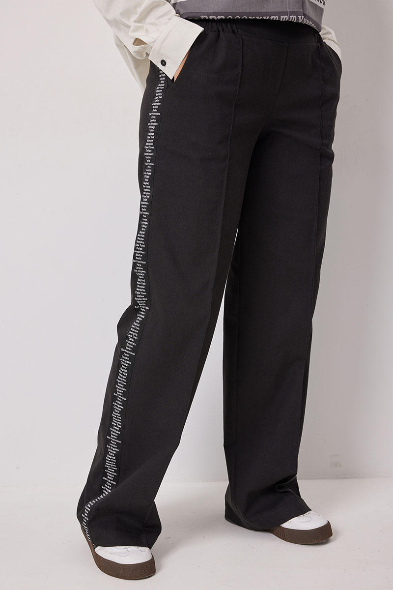 Брюки свободного кроя из тактильно приятной растяжимой джинсовой ткани - это модель которая необходима в гардеробе каждой модницы. Изюминка данной модели - настроченные декоративные ленты с текстовым принтом, что позволяет удлинить ножки благодаря акцентной вертикали в виде лент.