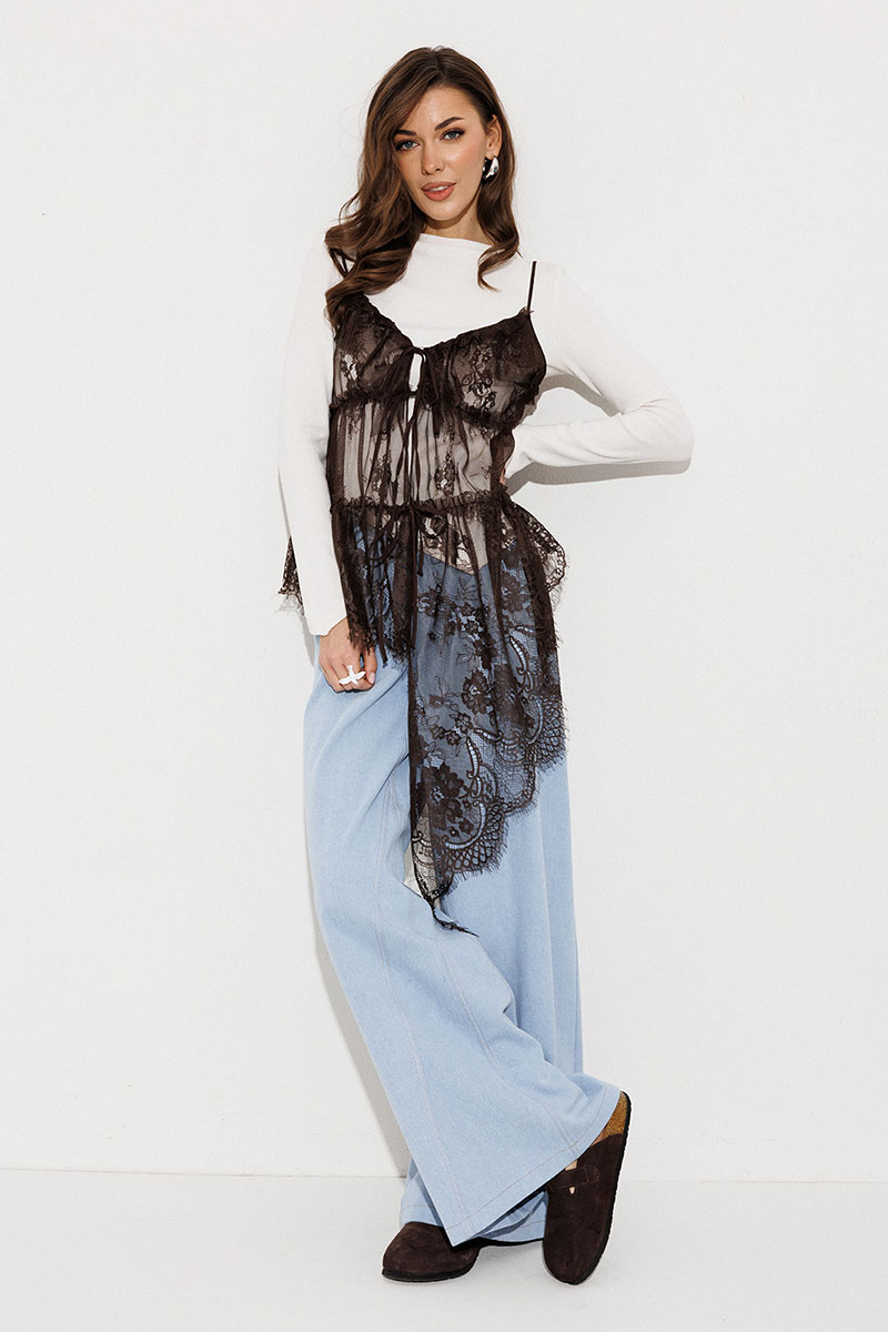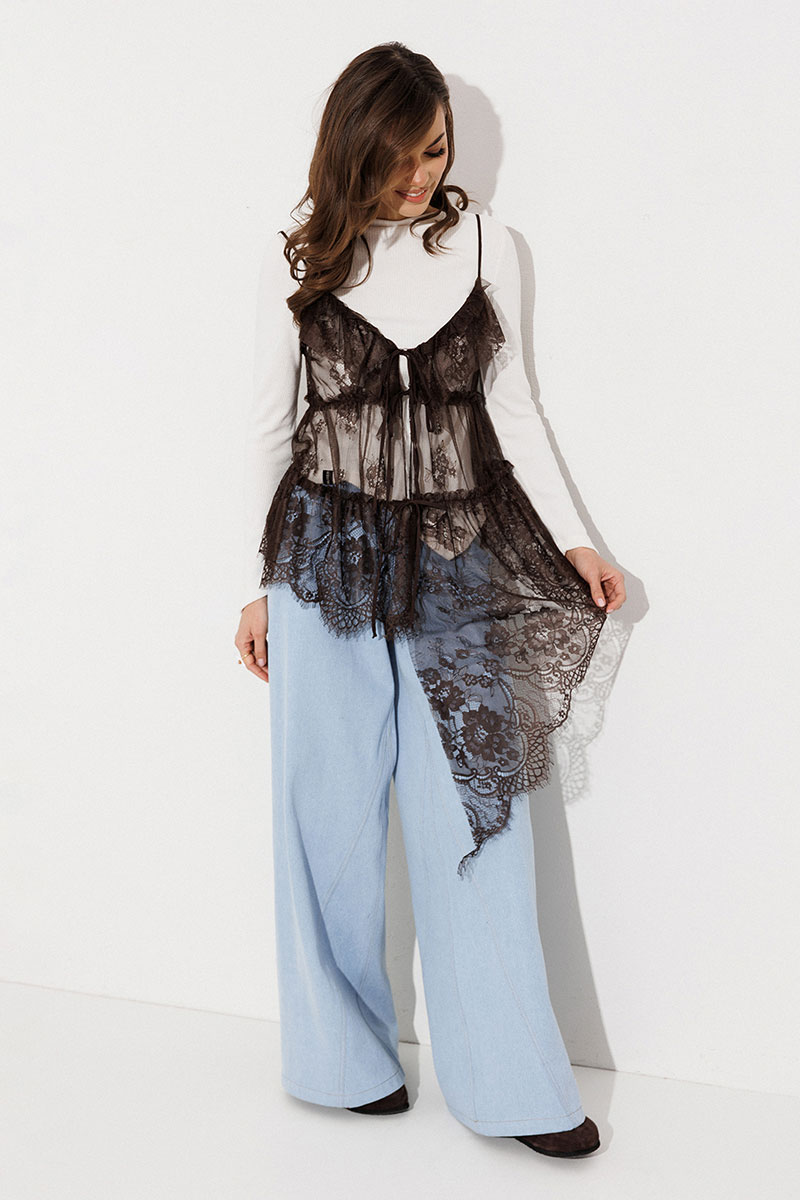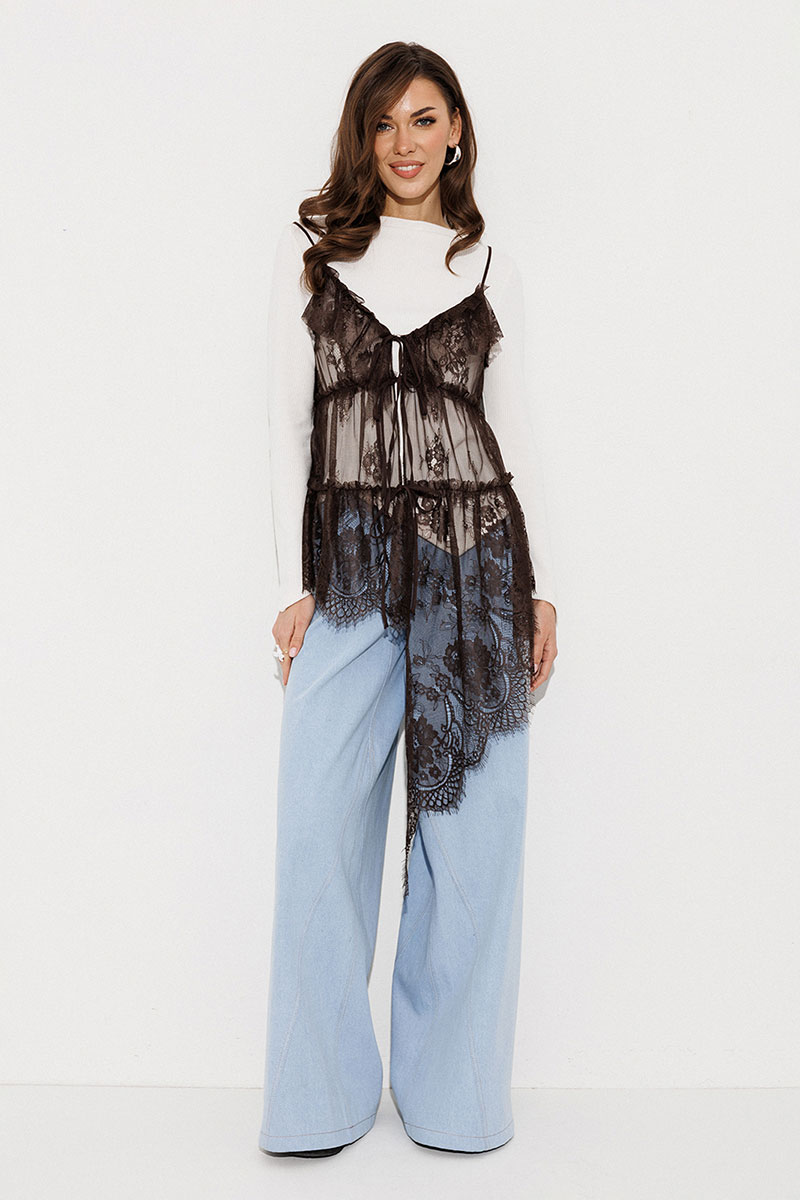 Блузка из кружева без подкладки на регулируемых бретелях и асимметричным низом. Полочка с V-образным вырезом и центральной застежкой на завязки. По горловине, пройме и спинке вверху вставлен волан со сборкой. По полочке и спинке настрочены рюши горизонтально.