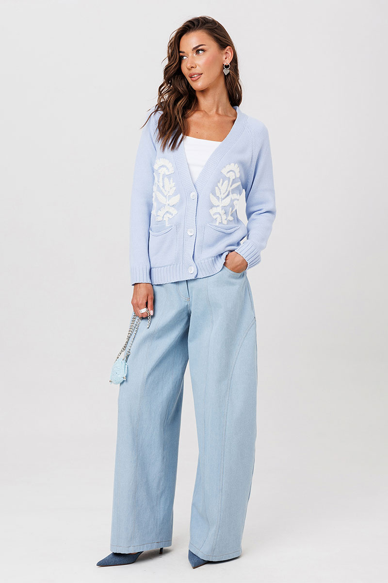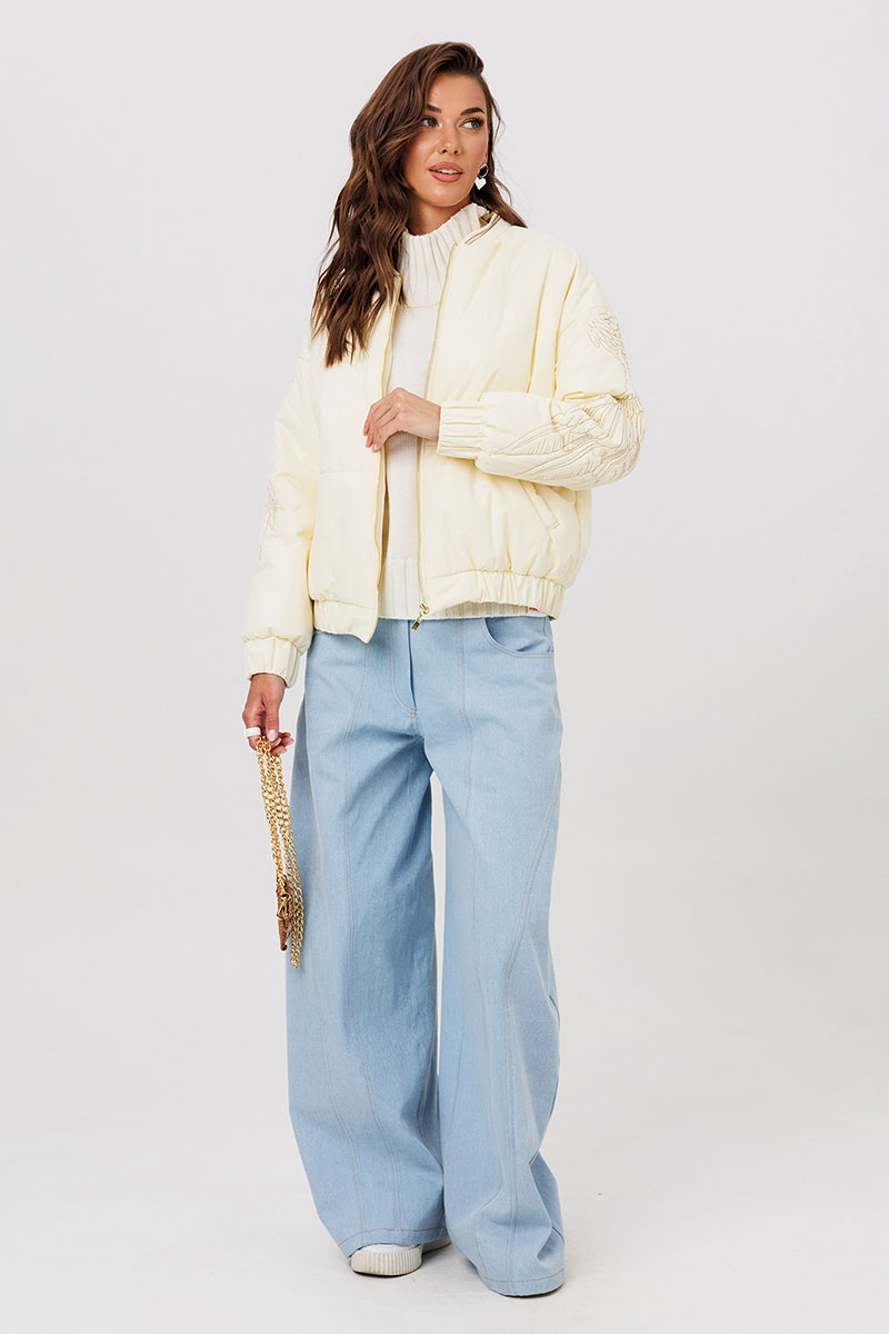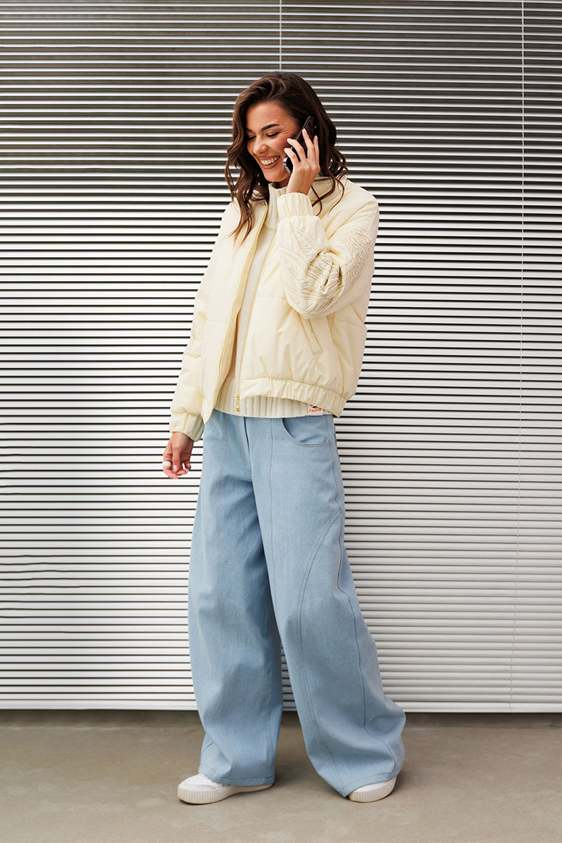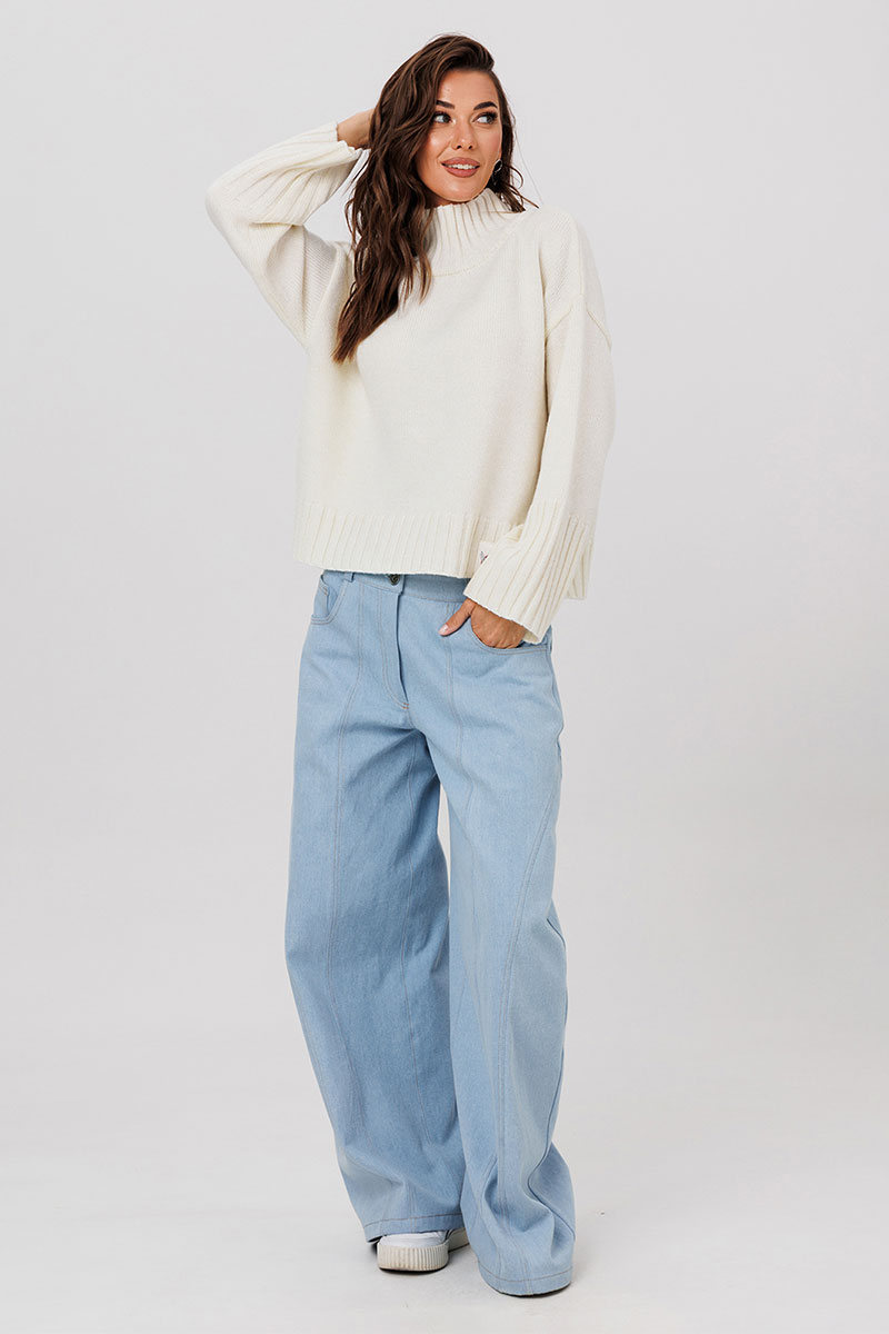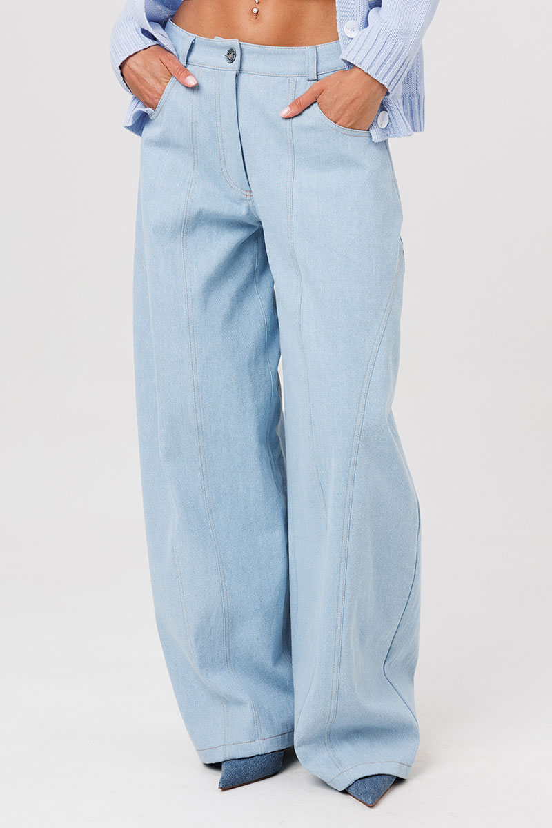 Брюки-джинсы немного заужены к низу. На притачном поясе со шлёвками, застежкой-гульфик. Пояс застегивается на петлю-пуговицу. По переду карманы и рельефы. По спинке кокетка, накладные карманы и рельефы.