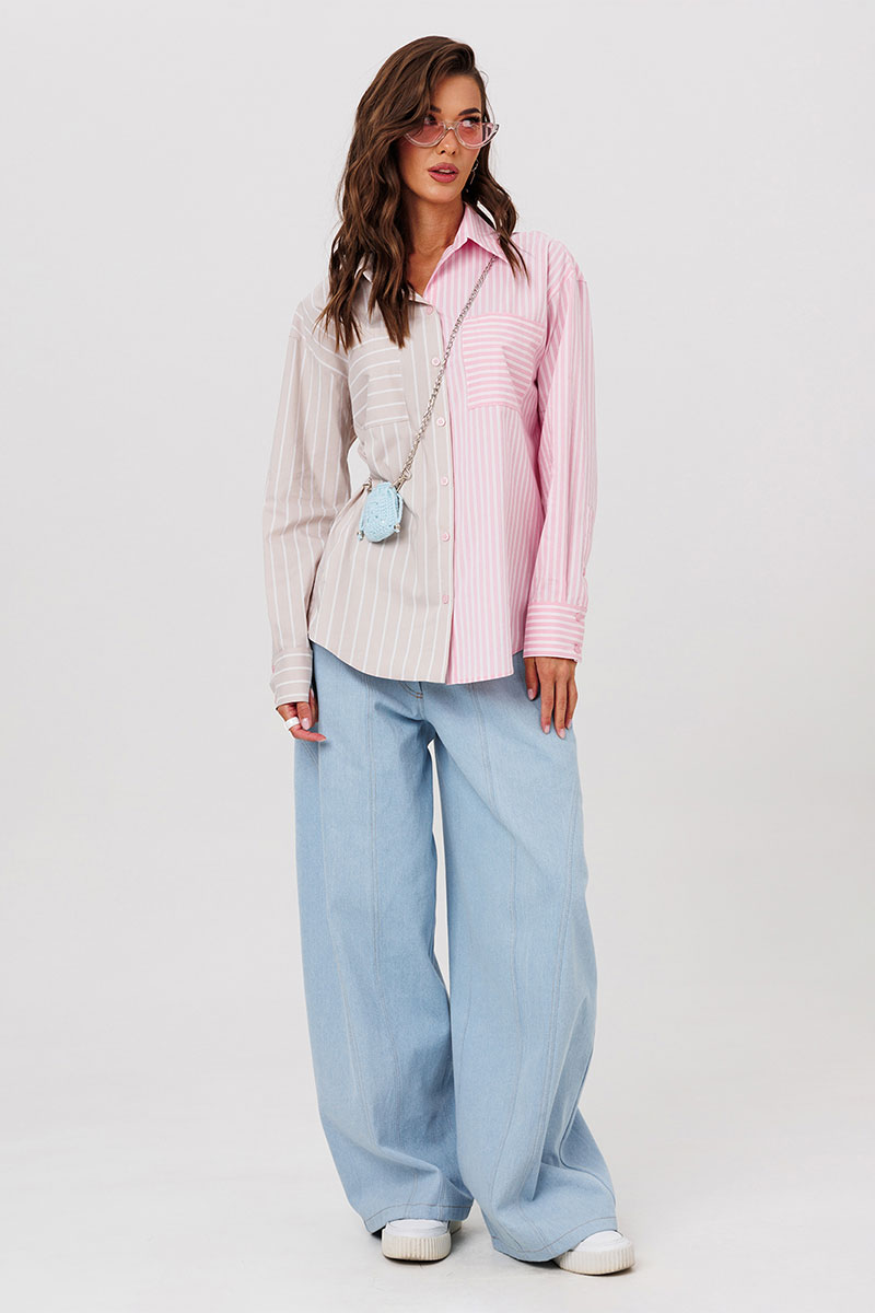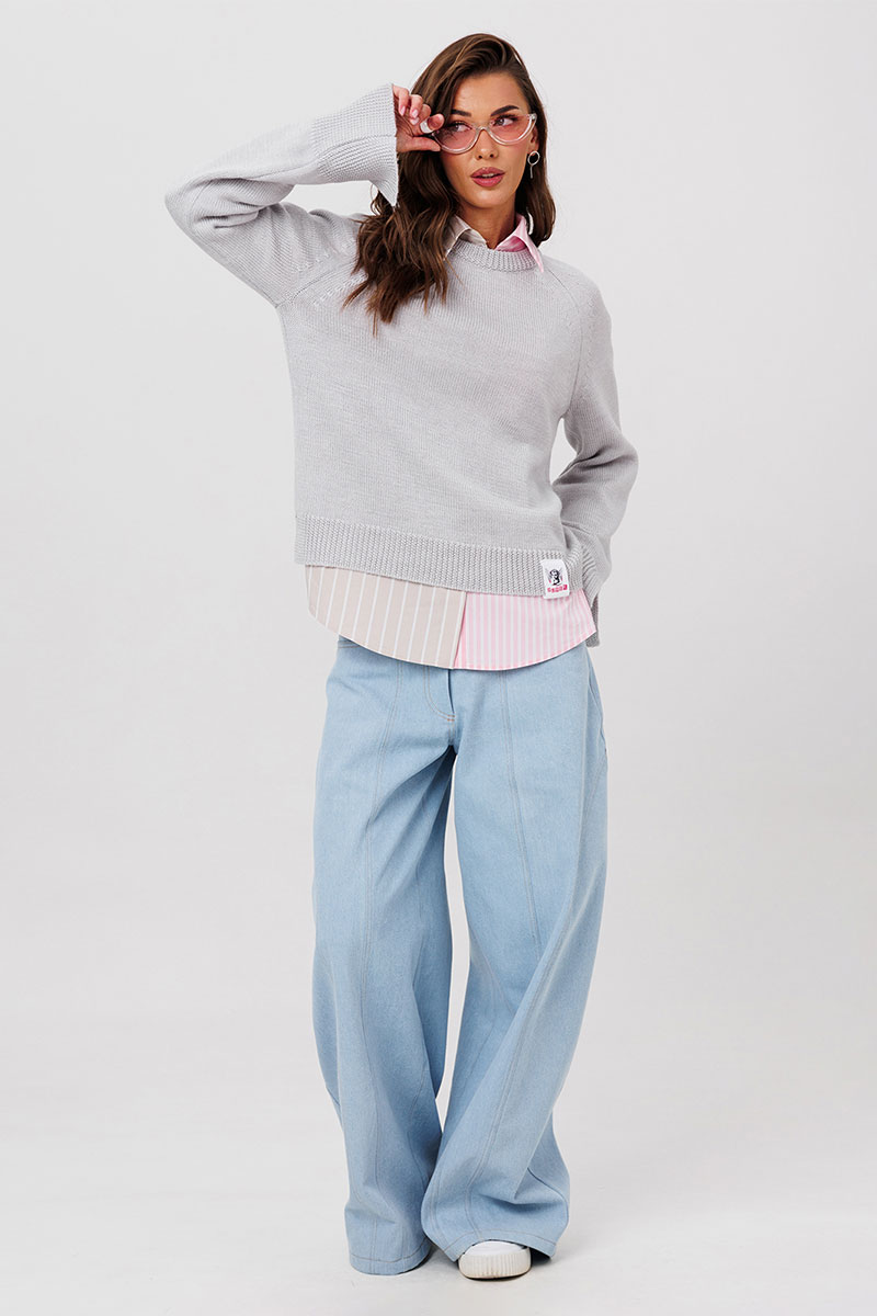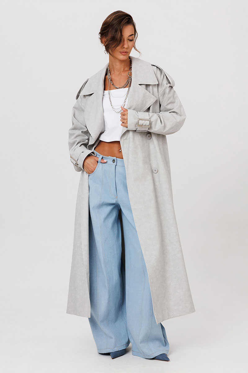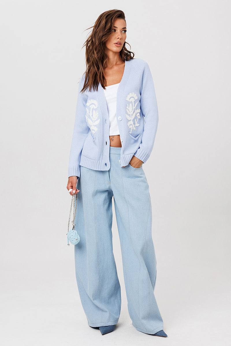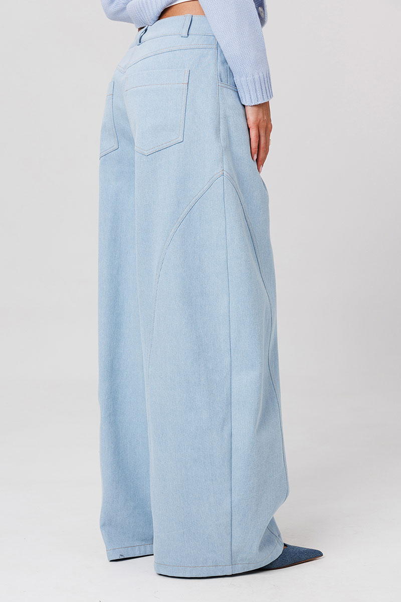 Брюки-джинсы немного заужены к низу. На притачном поясе со шлёвками, застежкой-гульфик. Пояс застегивается на петлю-пуговицу. По переду карманы и рельефы. По спинке кокетка, накладные карманы и рельефы.