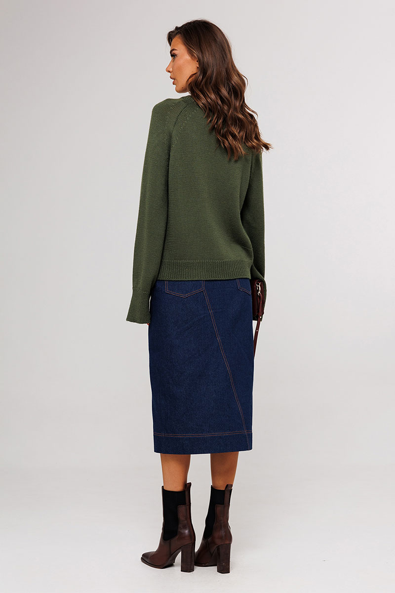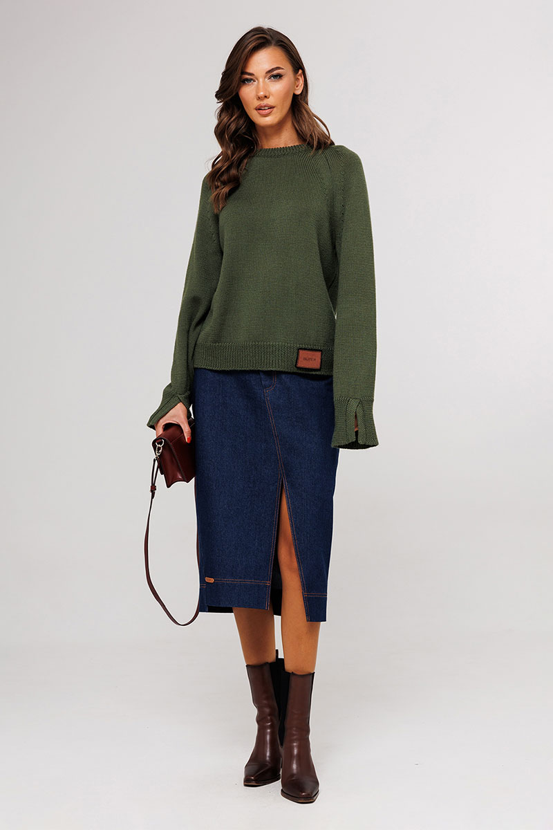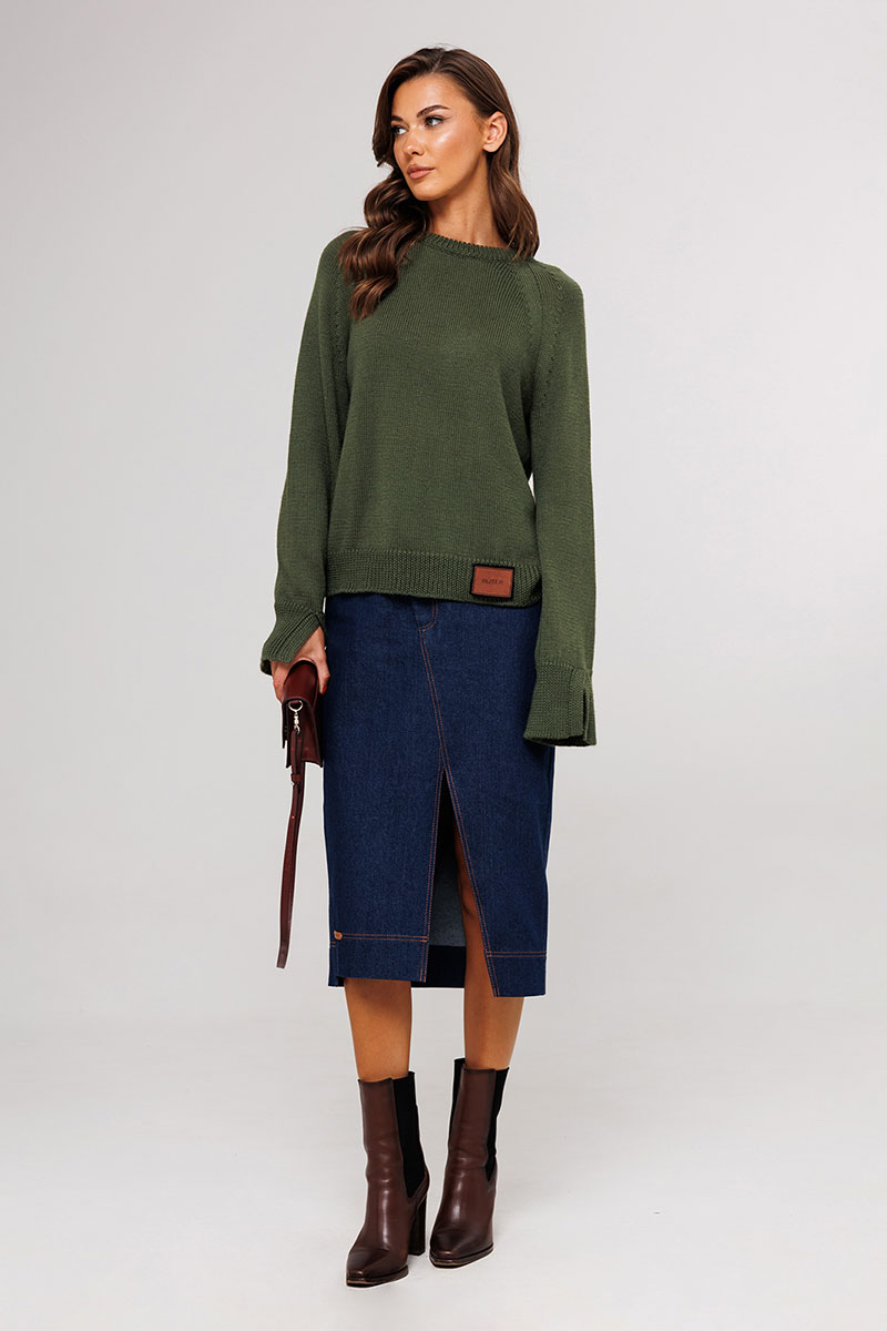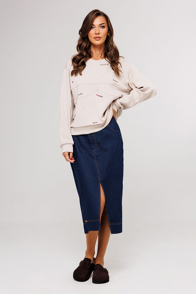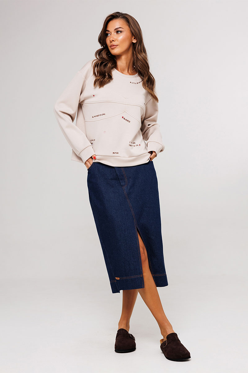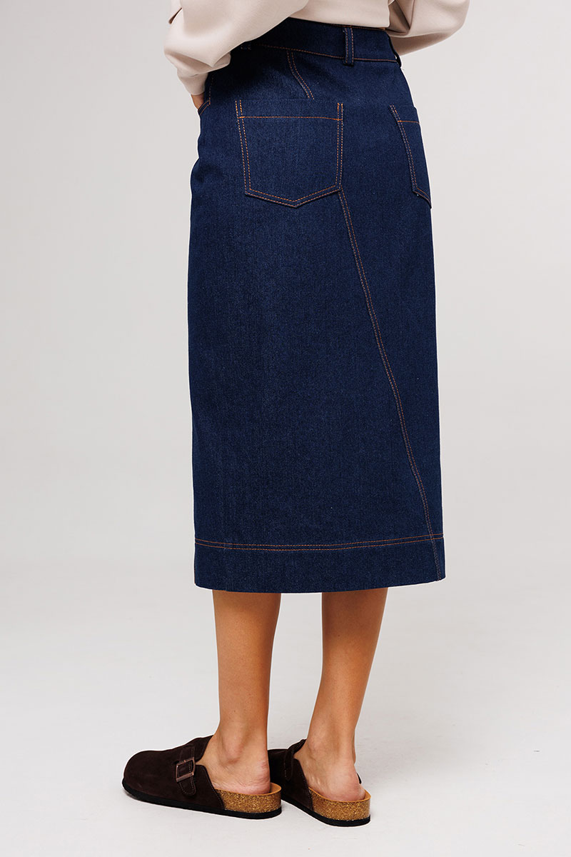 Юбка джинсовая, прямого силуэта, на притачном поясе со шлёвками, застежкой-гульфик. Пояс застегивается на петлю-пуговицу. По переду юбка с карманами от пояса и центральным швом, который идет по диагонали и заканчивается разрезом, по низу нашивка "BUTER". Сзади юбка с центральным швом, который расположен по диагонали и накладными карманами. Правый боковой шов к низу смещен на пред. Низ юбки асимметричный.