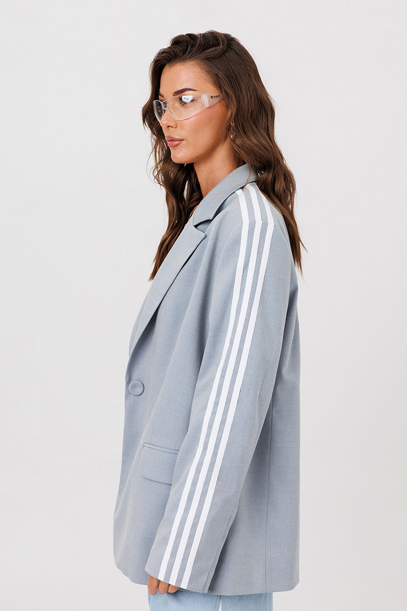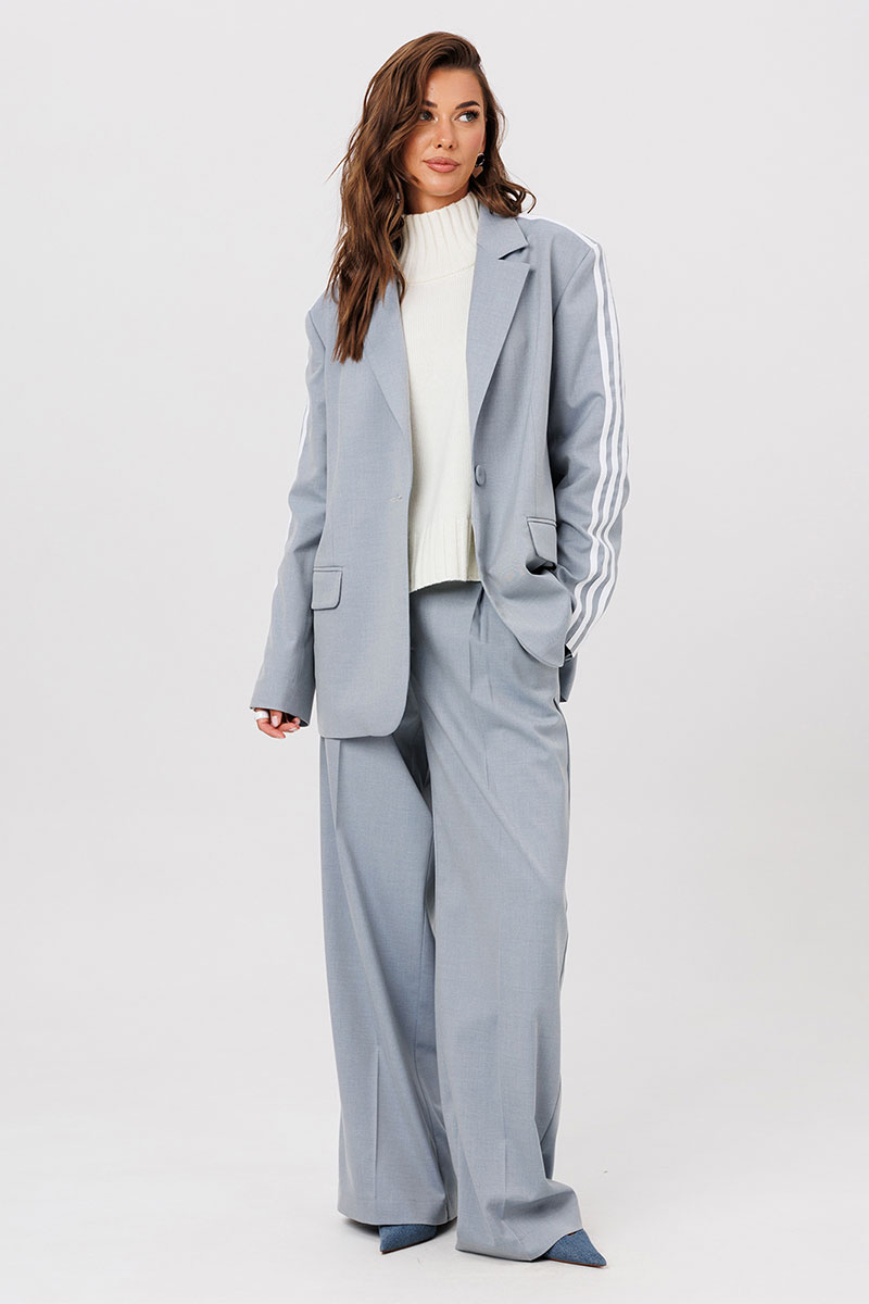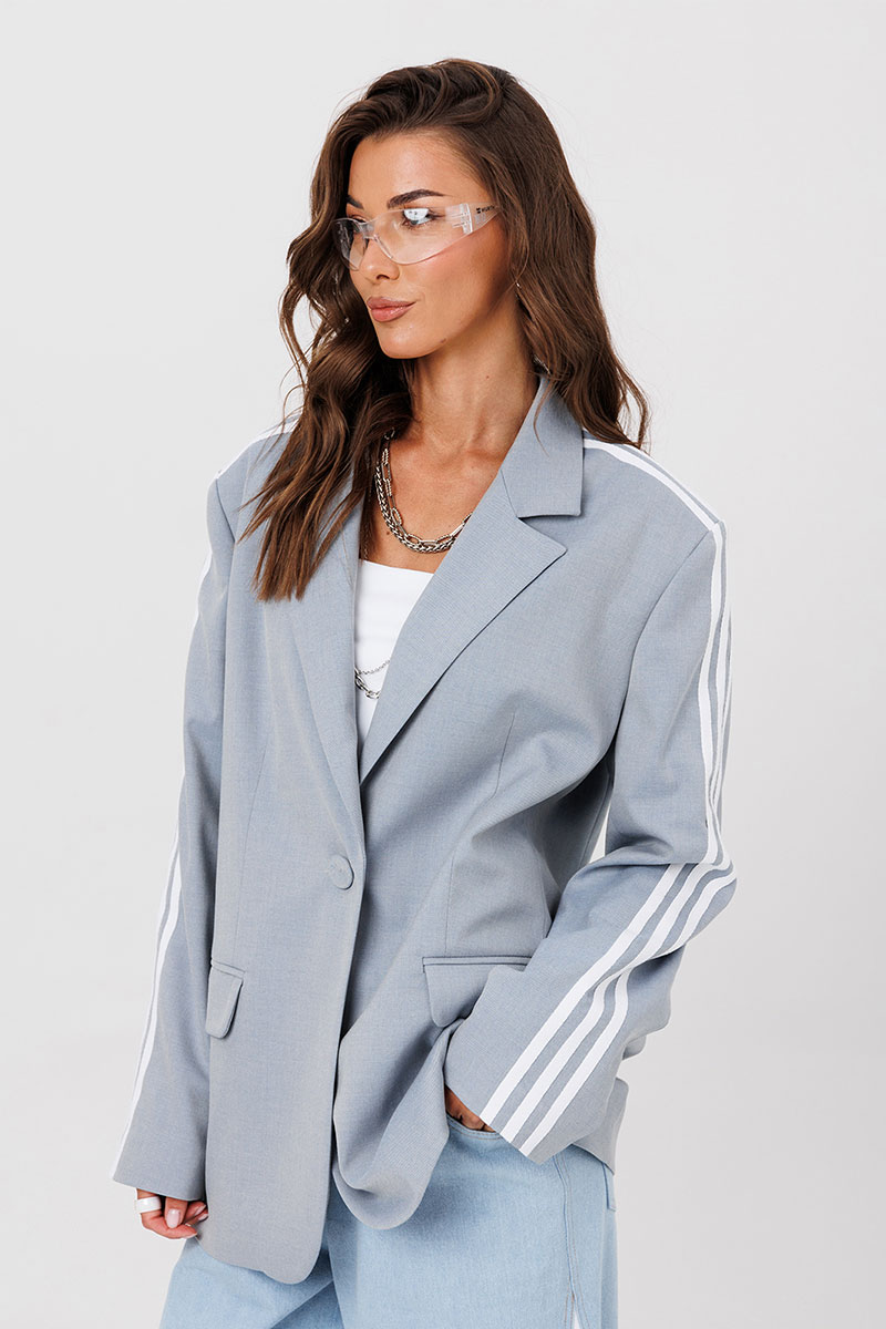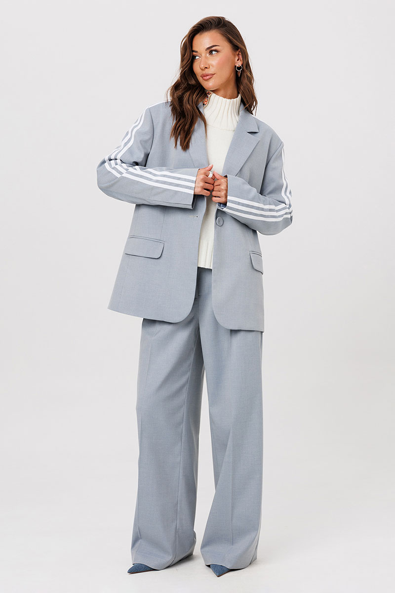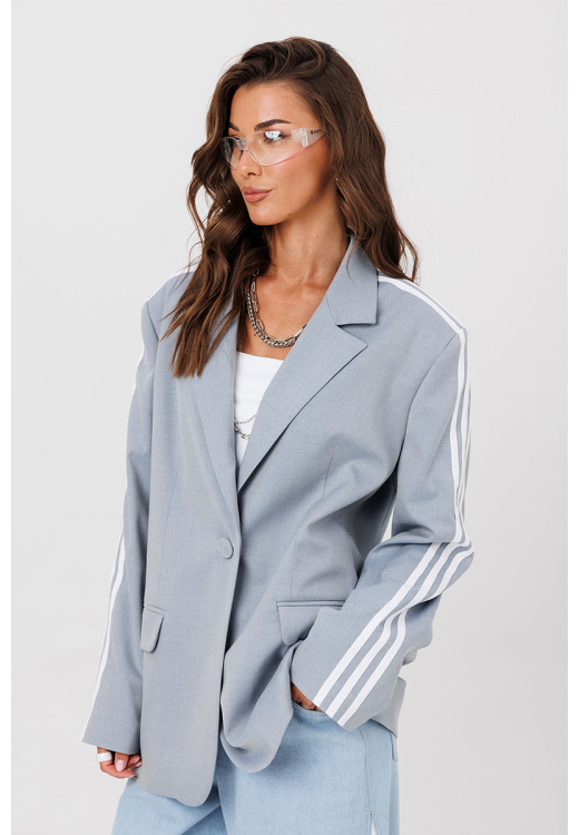 Жакет прямого силуэта, с однобортной застежкой на петлю-пуговицу, втачным двухшовным рукавом. Воротник отложной с лацканом. Полочка с отрезным бочком и талиевой вытачкой и карманом с клапанном и рамкой. Спинка со средним швом. Рукав и верх полочки и спинке (по плечу) с натрочными лампасами. Жакет на подкладке.